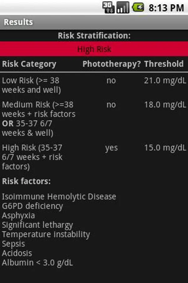 This tool allows physicians to determine the risk of hyperbilirubinemia (jaundice) and to decide when to initiate phototherapy. Recommendations are based on the 2004 AAP Guidelines.
