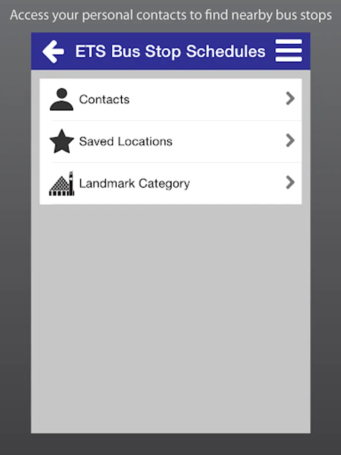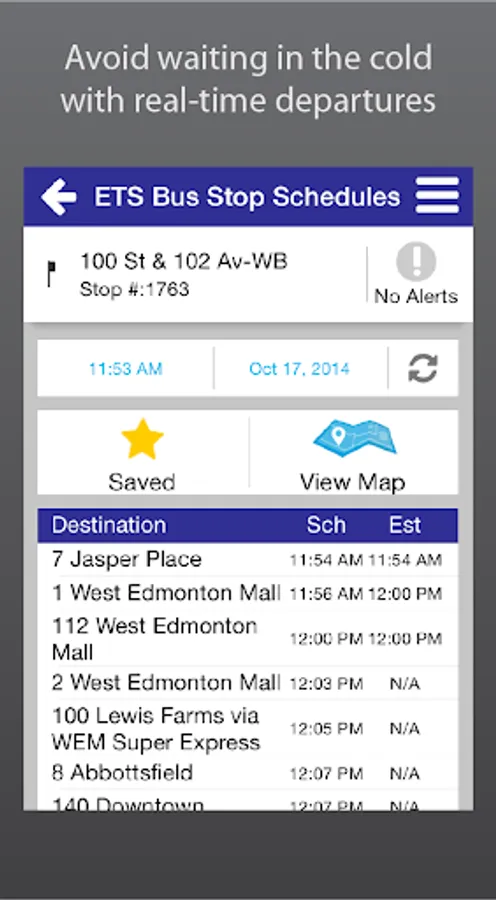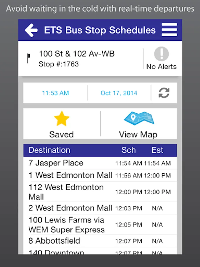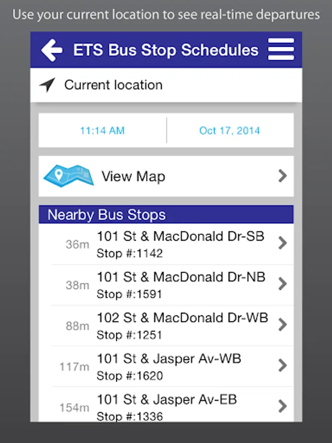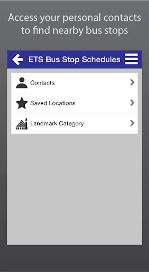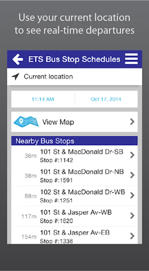 Take control of your time with ETS Live® To Go. Get real-time information for ETS Smart Bus routes anytime, anywhere. Use your current location to see real-time departures instantly, or access your personal contacts straight from the app to find nearby bus stops. Save your favourite bus stop, address or landmark for future convenience. With ETS Live® To Go, your bus is just a touch away!
