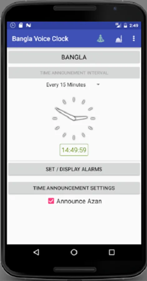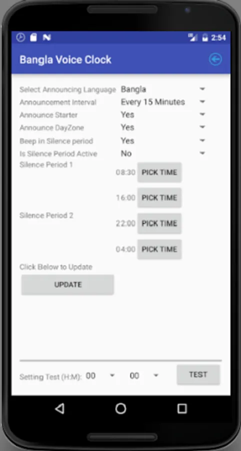 Time announcement settings can be done on the main screen, partially but a full set of settings done on a settings page. Announcement patterns were set in the many segments. Time announcement has few segments, starter, time period, and silence period and beeps during that period.