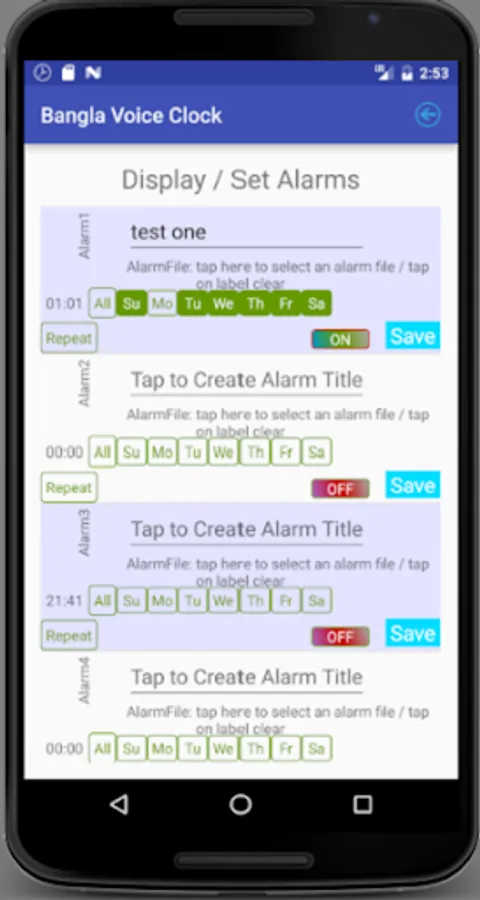 There are sixteen alarms can be set to remind you daily or any week day. These settings are available through main screen. Alarm can use your voice to remind you. You can either record a new audio or select from the system for any sound file to remind you. You may leave the sound file empty to sound the default alarm sound of the system.