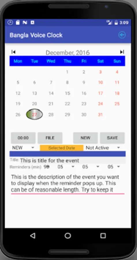 You can create a calendar event using the tool. This calendar is independent of system calendar and one can record a reminder audio. This mean you can have your own voice or voice of someone you love to remind you about the event.
