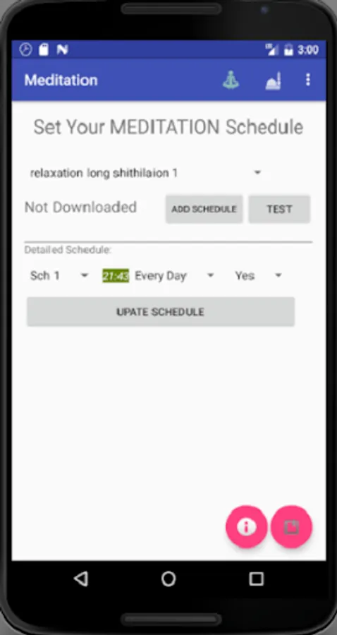 You can schedule your meditation time with playing the meditation file. The meditation files may be played directly from Quantum Method website or from the downloaded file from that site. Two floating action bar at the bottom will help you identify current setting on that and toggle the setting. The tool will provide a lot of freedom on creating meditation practice schedule on multiple meditation or same one.