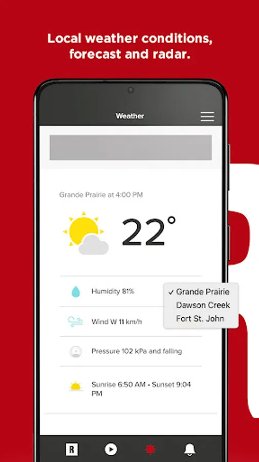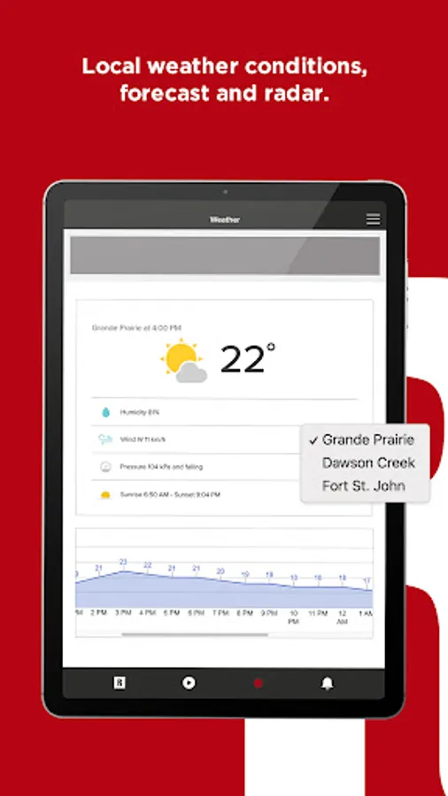 - Live local weather conditions, including hourly and 7-day forecasts and radar maps from Environment Canada