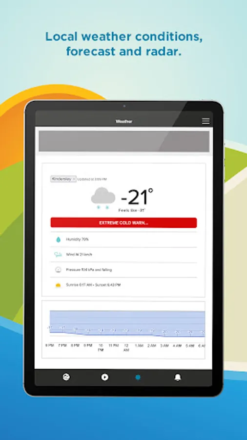 - Live local weather conditions, including hourly and 7-day forecasts and radar maps from Environment Canada