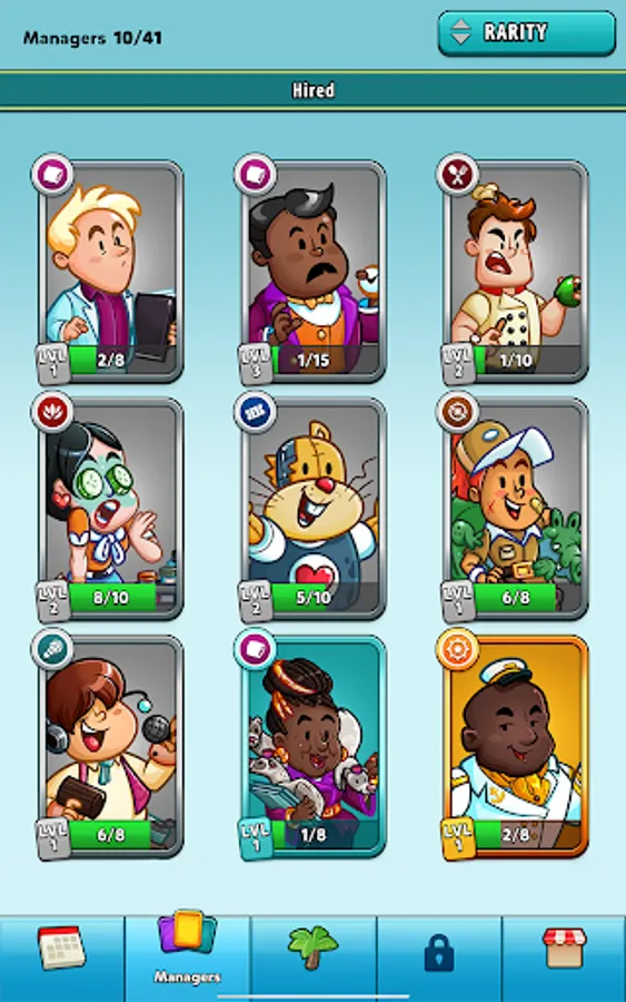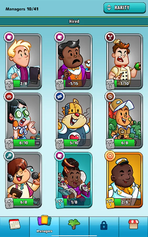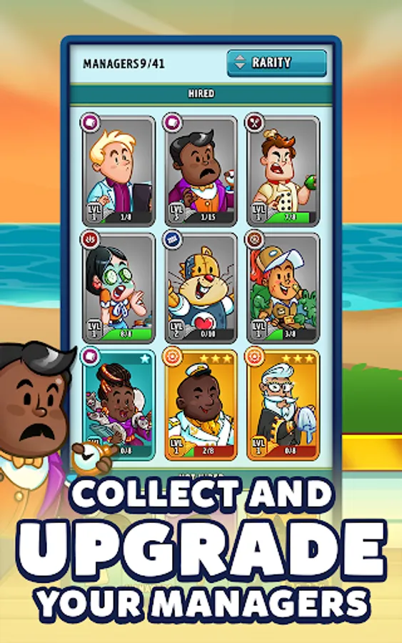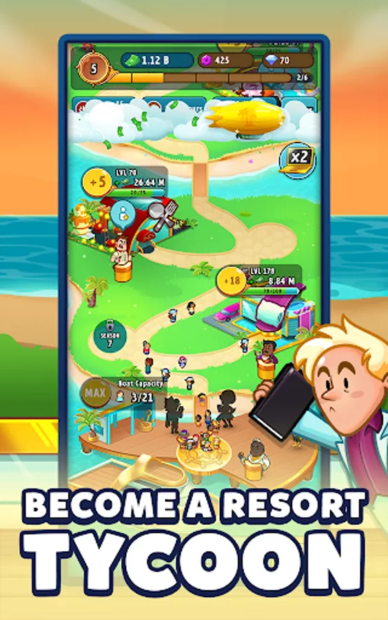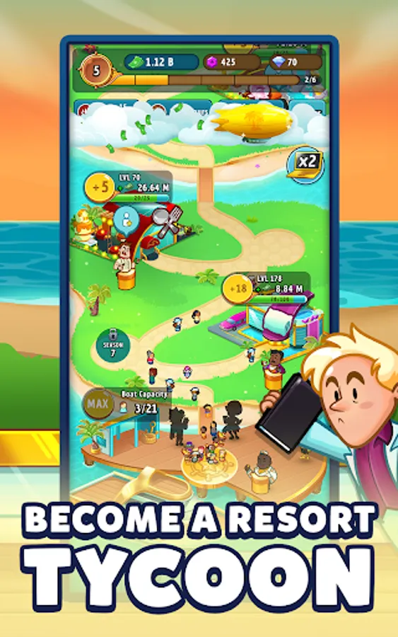 Earn and collect different Resort Managers to help build the perfect paradise! Each Manager is equipped with unique abilities! Promote your Managers to increase your money making abilities so that you can relax and focus on building to become a Vacation Tycoon!