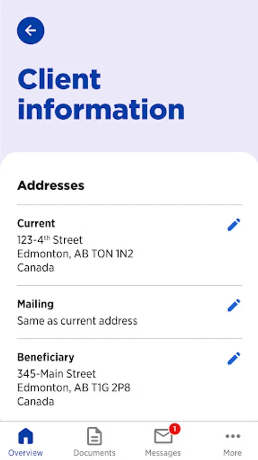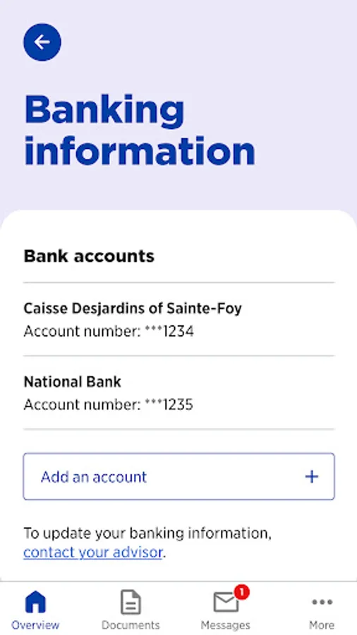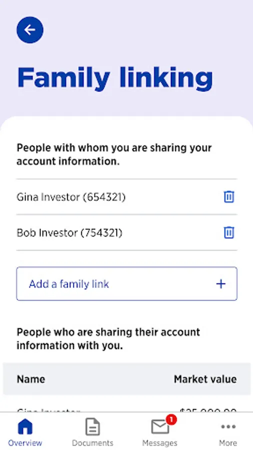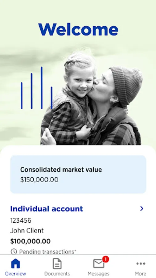 Allows you to view the details of all your accounts, the list of client numbers belonging to the client connected to the application, the consolidated market value of all accounts, including those of family relationships created to share account information with you
