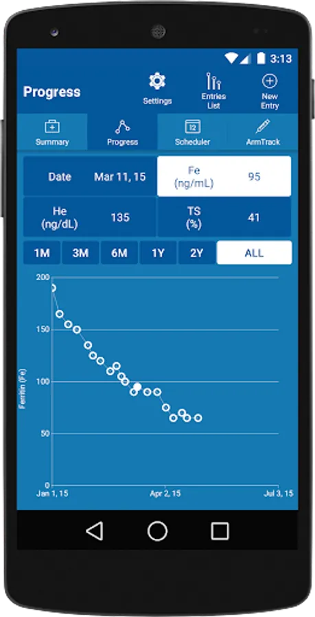 Iron Tracker provides graphical tools to deepen understanding of hemochromatosis treatment. This genetic disorder is characterized by over absorption of dietary iron, leading to dangerously high iron levels. If left untreated this can cause many systemic problems, from fatigue, pain and generally poor wellness to severe damage and disease of the liver, heart and other organ systems. Treatment is performed through regular therapeutic phlebotomies, the drawing of a patient’s blood, and is monitored through blood samples tracking hemoglobin and ferritin, an iron-bearing protein found throughout the body.
