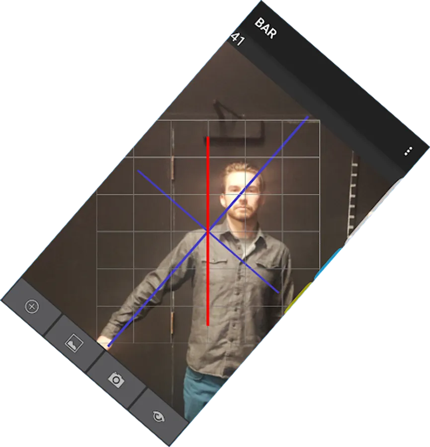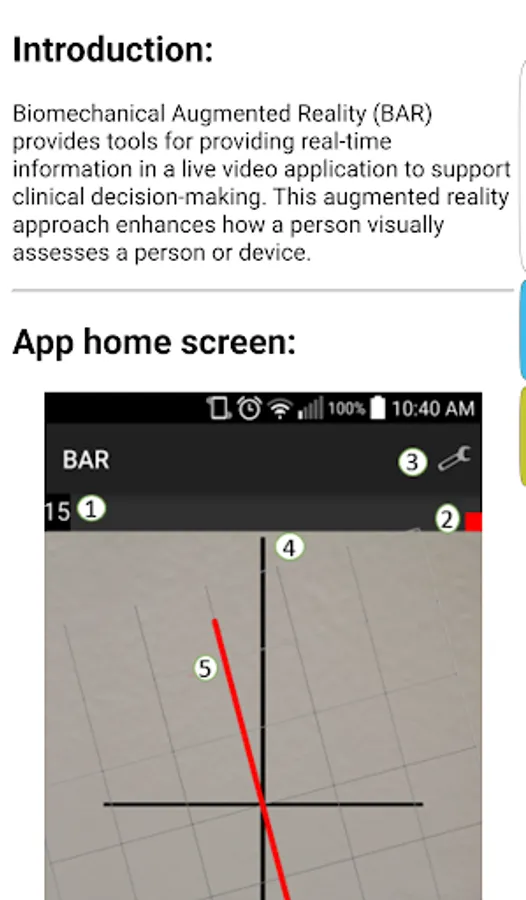Biomechanics Augmented Reality (BAR) provides real-time information in a live video application to support clinical decision-making. A constant vertical line and grid, based on gravity, provides a reference for aligning or interpreting position. Lines representing the phone's orientation can be added to enable angle measurement to the vertical gravity line. You can also save and share images. This augmented reality approach enhances how a person visually assesses a person or device.