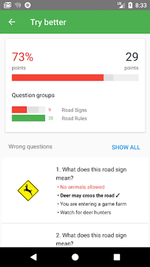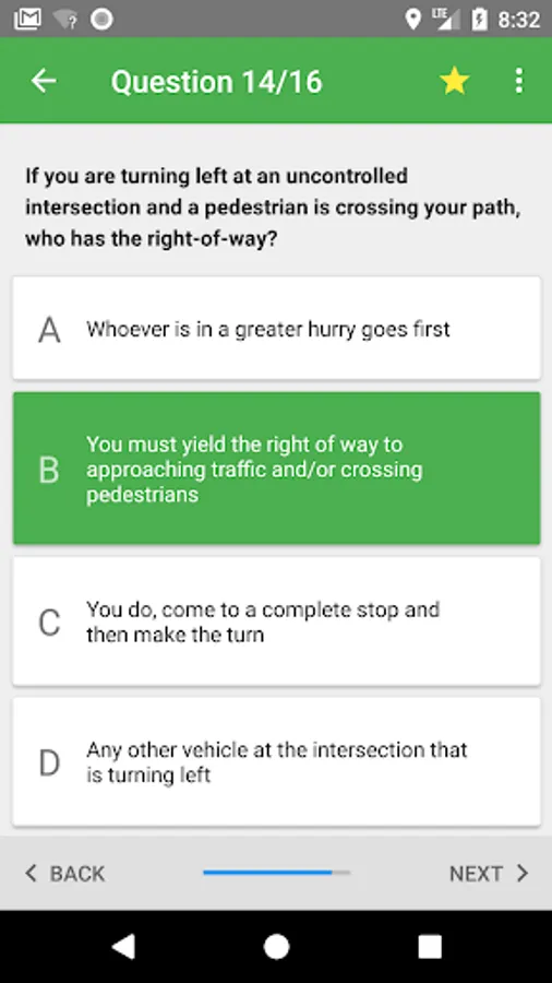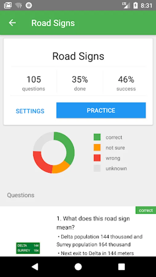 You can practice questions by topic (signs, traffic situations, rules), trouble-making questions or starred (favorite) questions.