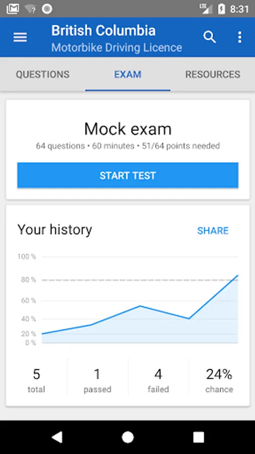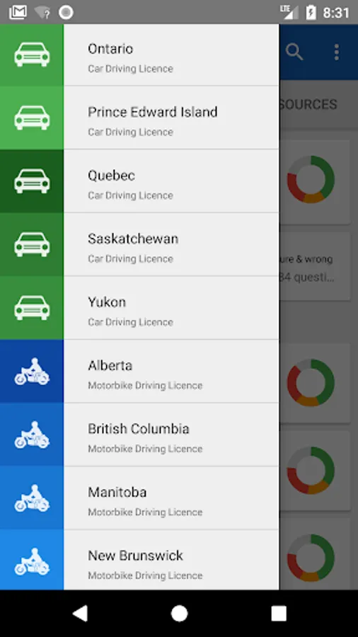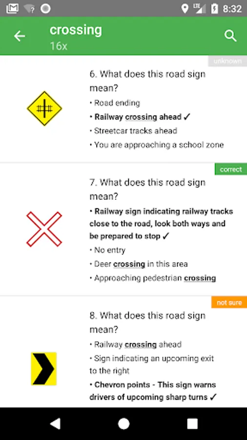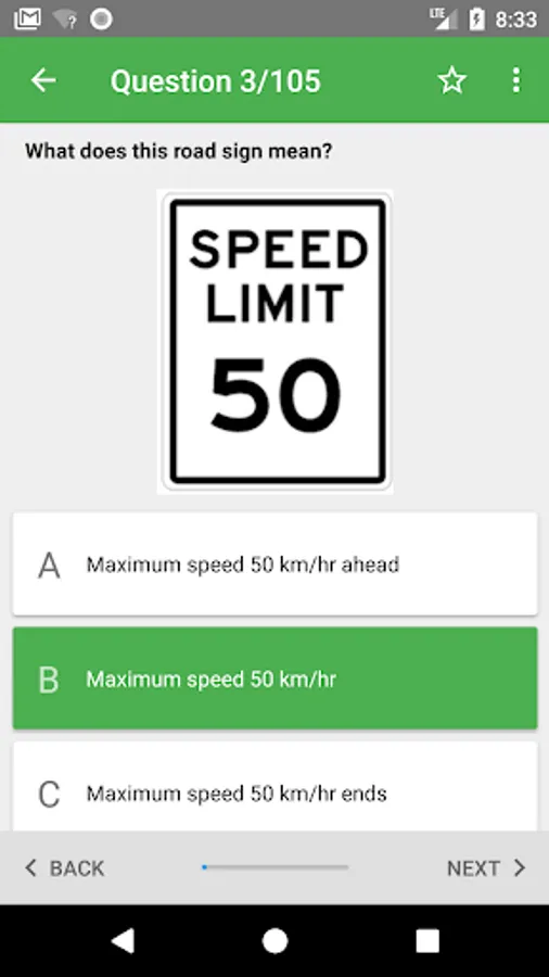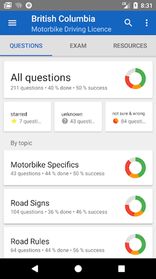 You can practice questions by topic (signs, traffic situations, rules), trouble-making questions or starred (favorite) questions.