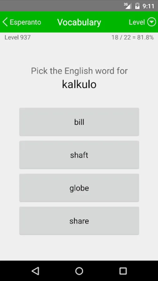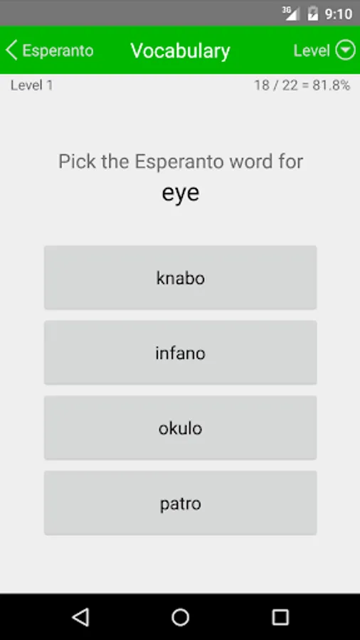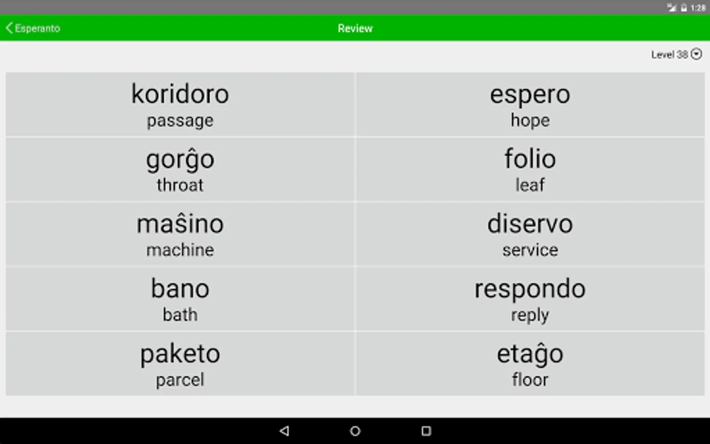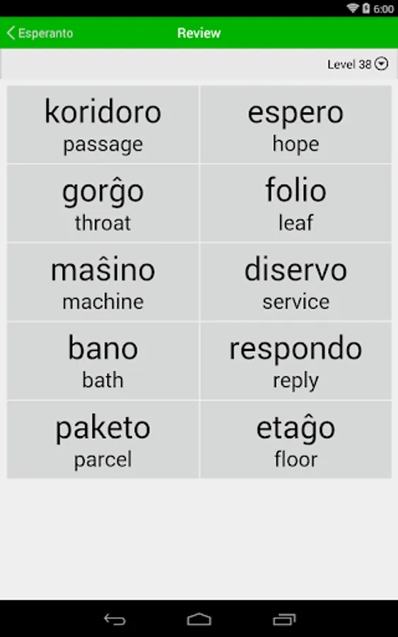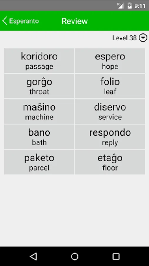 Liberation Philology Esperanto helps you build your Esperanto vocabulary in a convenient format available wherever you take your phone. It presents 1157 levels of vocabulary, each of which tests your ability to match a group of ten Esperanto words with their English equivalents. Your answers are immediately confirmed or corrected, and whenever you feel you've mastered a level, you can move on to the next. Periodic cumulative levels are interspersed among these to reinforce your knowledge (giving a total of 1300 levels) and you can also review the word list at any point.