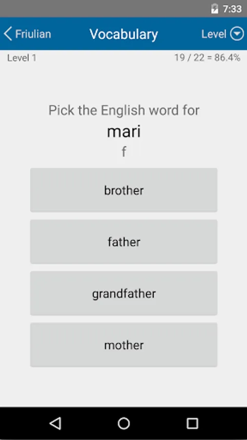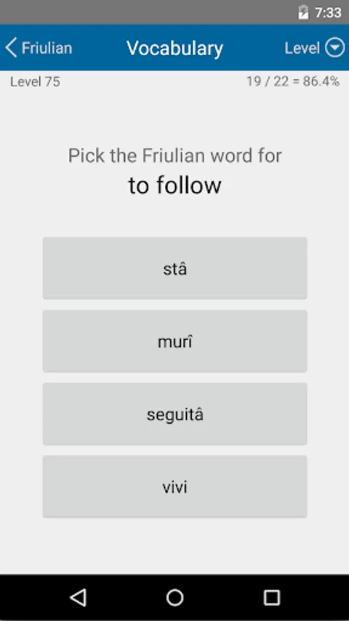 • Vocabulary: 125 levels, each testing your ability to match ten Friulian words with their English equivalents. Interspersed among these are cumulative levels reviewing what has been learned earlier (giving a total of 142 levels).