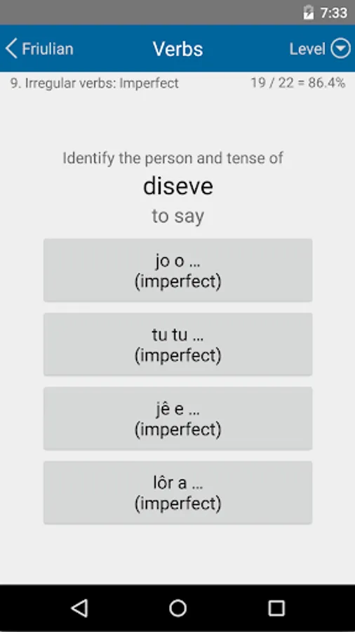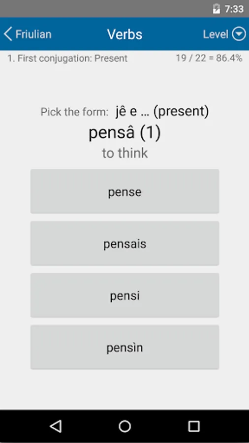 Wherever you have your phone and a free moment, it offers a continuous multiple-choice test on Friulian vocabulary and the conjugation of Friulian verbs. Each answer you give is immediately confirmed or corrected, and your knowledge is reinforced by repetition.