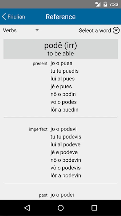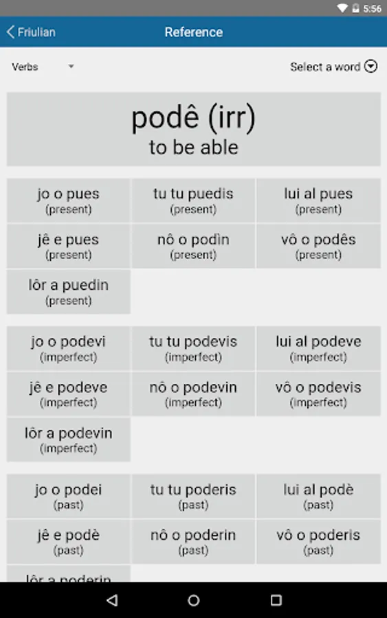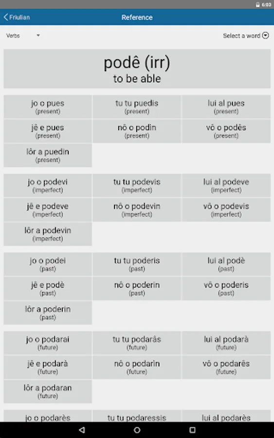 • Verbs: Tests your ability to parse and to conjugate a range of representative regular and irregular Friulian verbs.