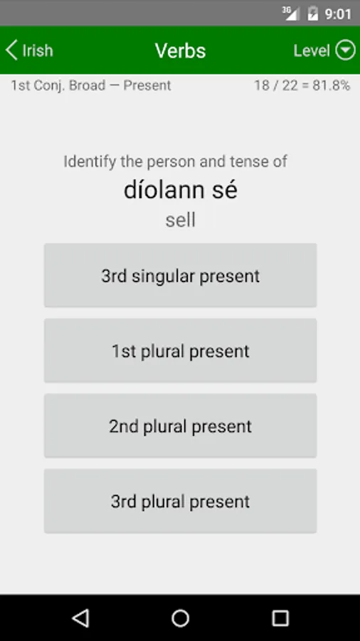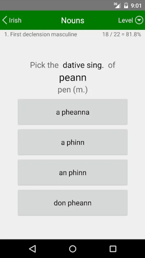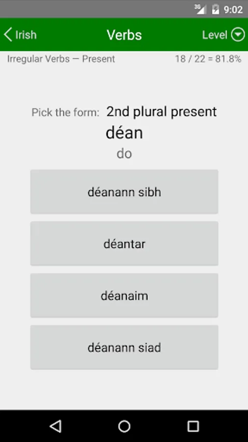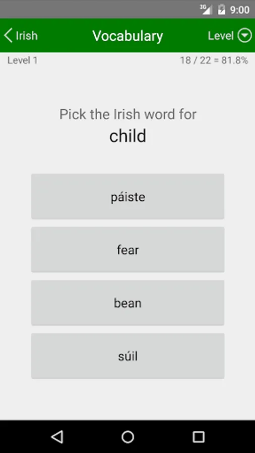• Vocabulary: 450 levels, each testing the translation of 10 words between Irish and English. Interspersed among these are cumulative levels reviewing what has been learned earlier (for a total of 506 levels).