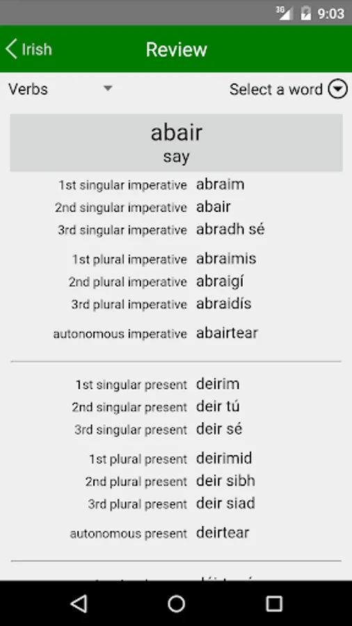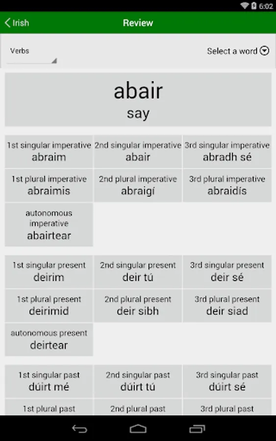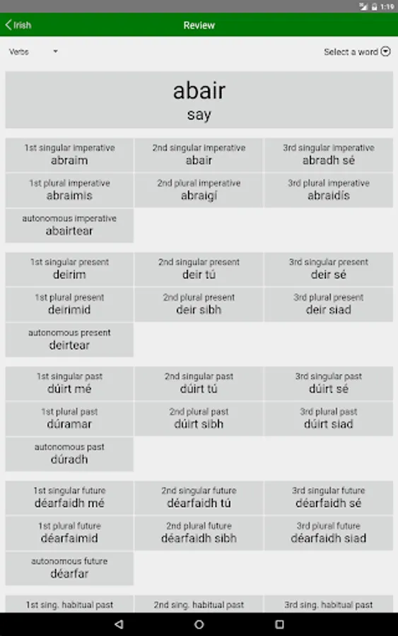 • Verbs: Tests your ability to parse and conjugate all classes of regular and irregular Irish verbs.