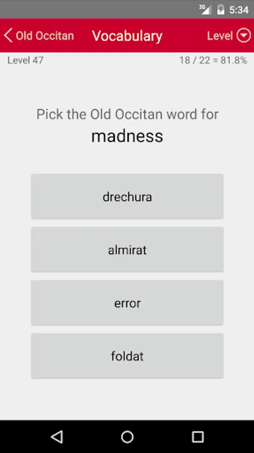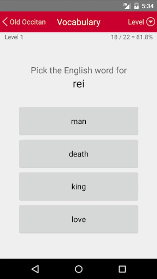• Vocabulary: Each of 150 levels tests you on the translation of 10 words between Old Occitan and English, selected for their appropriateness to Occitan literature. Interspersed among these are cumulative levels reviewing what has been learned earlier (giving a total of 169 levels).