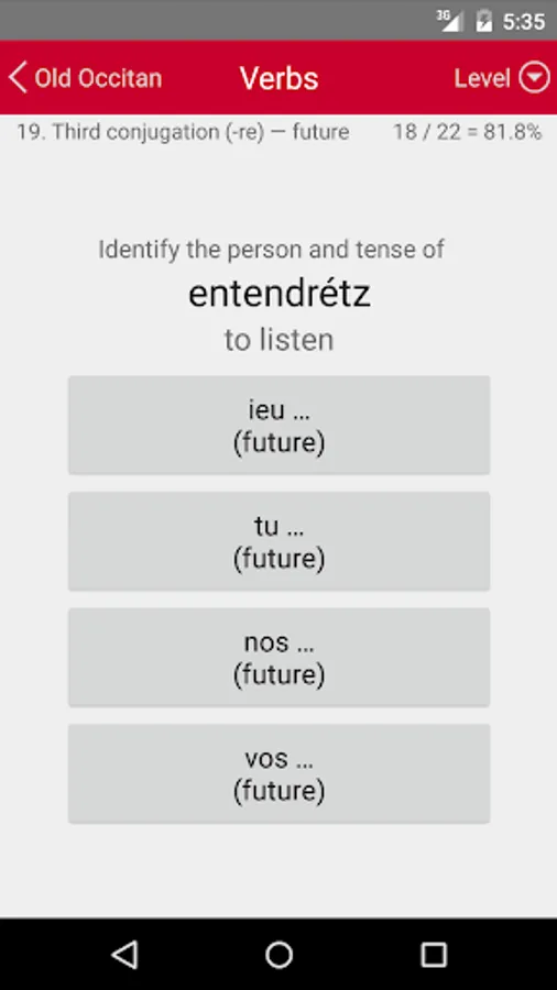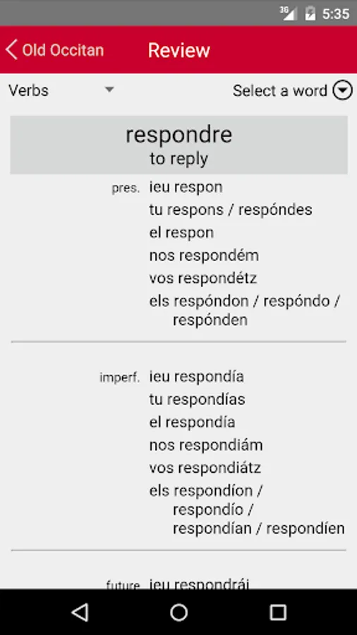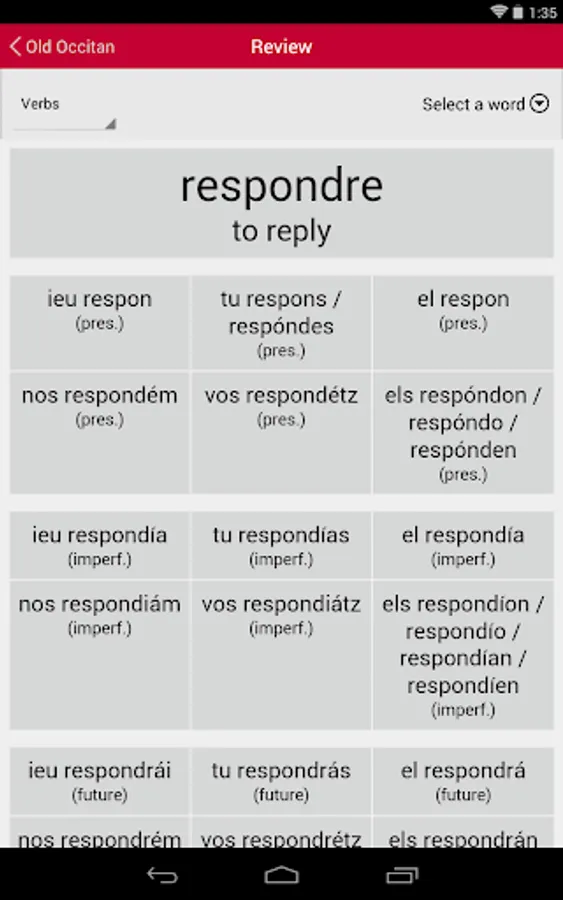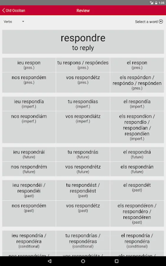 • Verbs: Tests your ability to parse and conjugate a full range of regular and irregular Old Occitan verbs. As the language was never fully standardised, many forms are presented in multiple spellings or variants, to ensure that you learn to recognise the many possibilities.