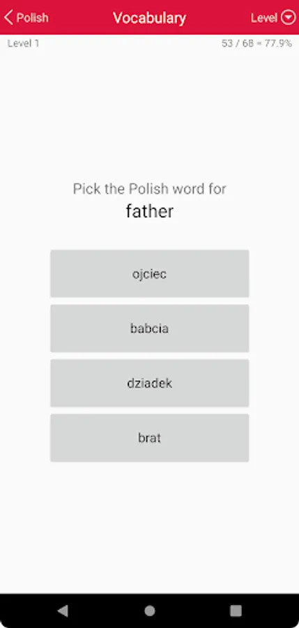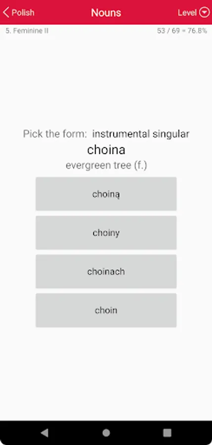 Wherever you have your phone and a free moment, it offers a continuous multiple-choice test on Polish vocabulary and grammar. Each answer you give is immediately confirmed or corrected, and your knowledge is reinforced by repetition.