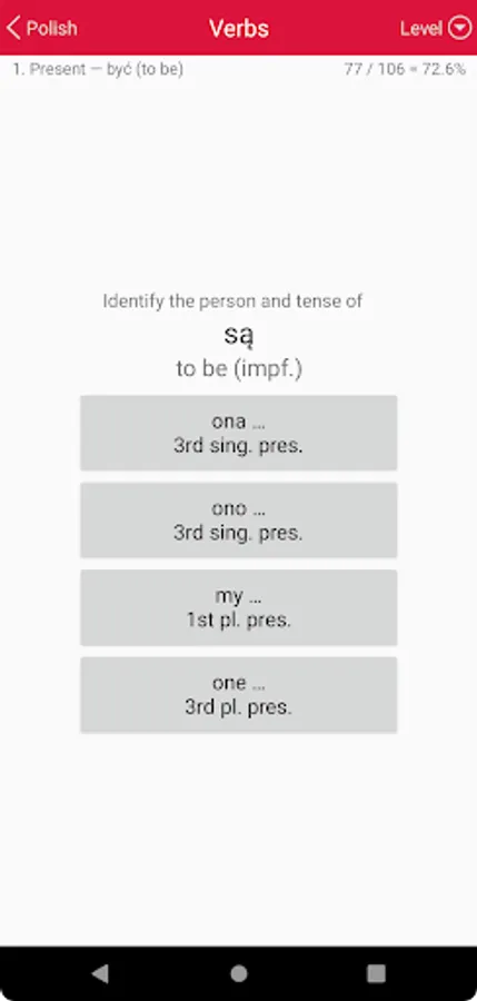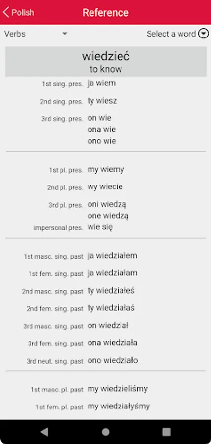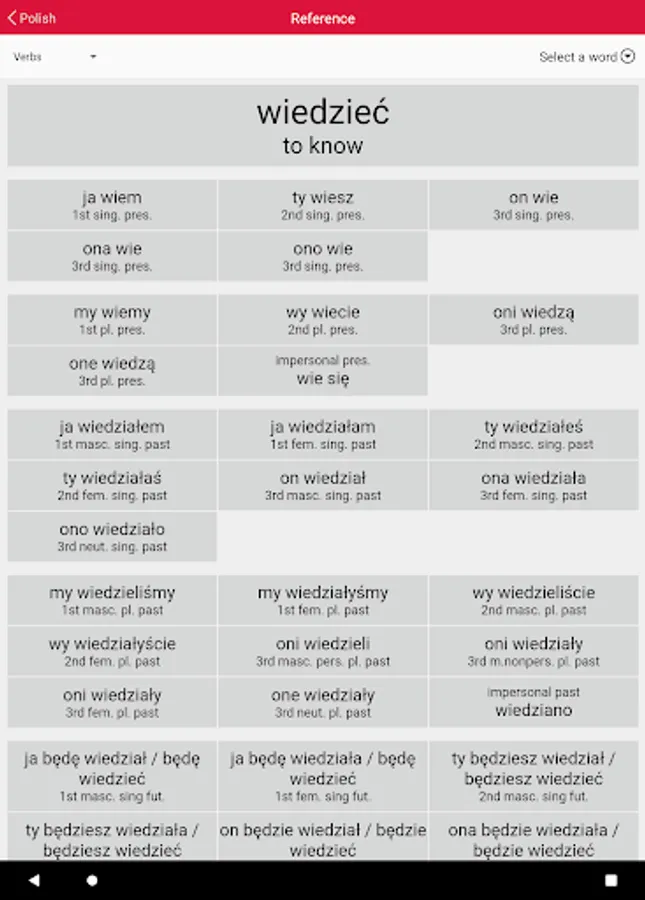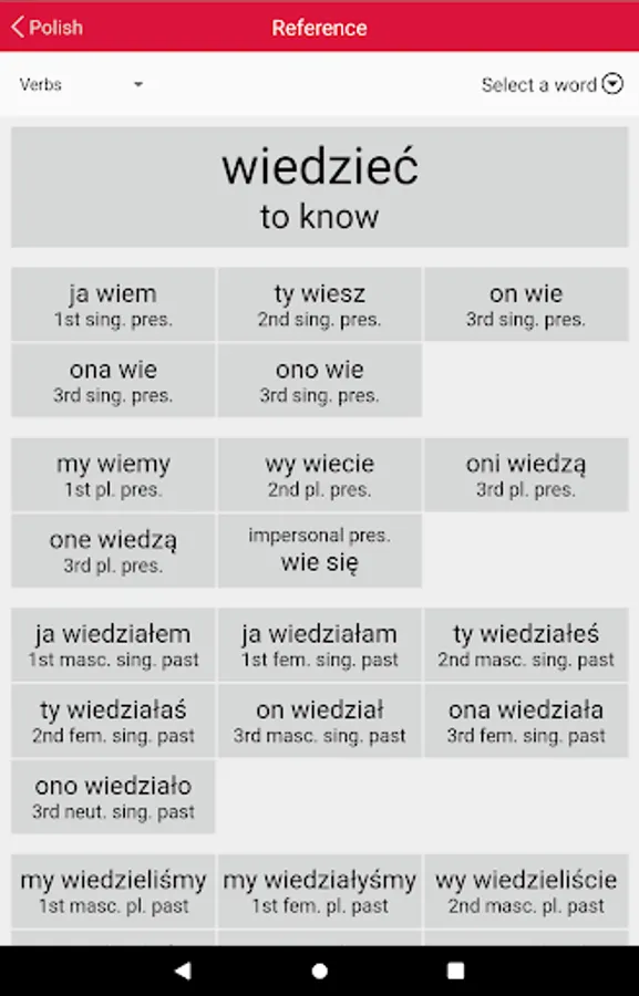 • Verbs: Tests your ability to parse and to conjugate a range of representative Polish verbs.