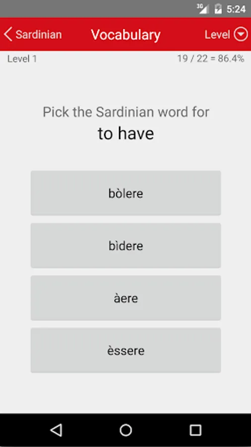 • Vocabulary: 200 levels, each testing your ability to match ten Sardinian words with their English equivalents. Interspersed among these are cumulative levels reviewing what has been learned earlier (giving a total of 226 levels).