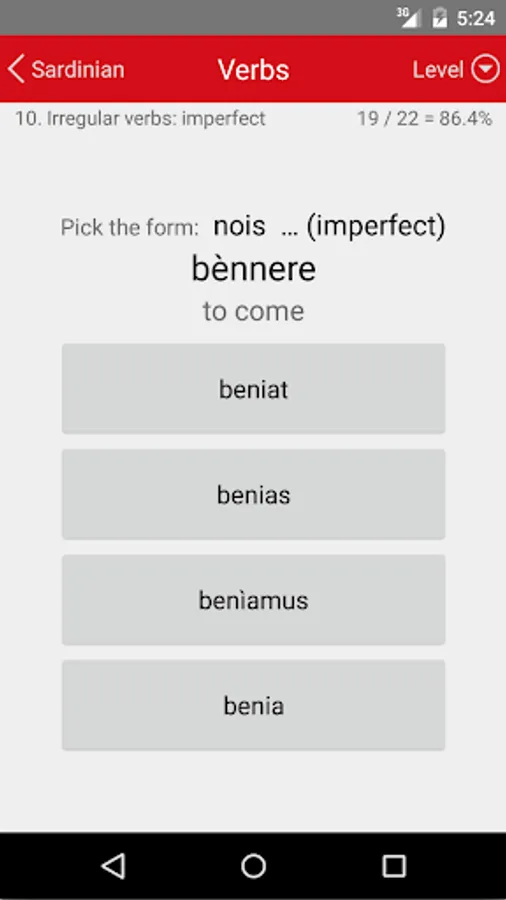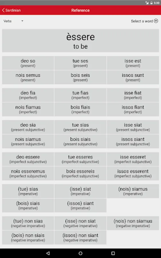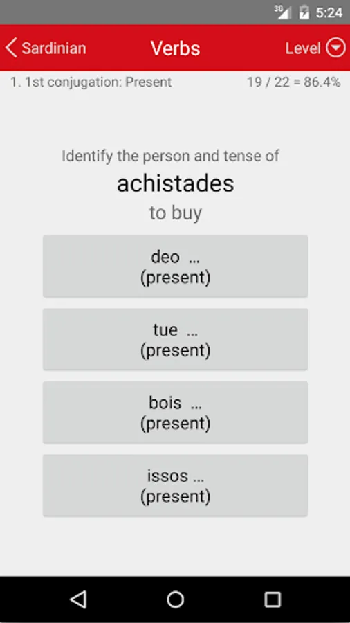 Wherever you have your phone and a free moment, it offers a continuous multiple-choice test on Sardinian vocabulary and the conjugation of Sardinian verbs. Each answer you give is immediately confirmed or corrected, and your knowledge is reinforced by repetition.