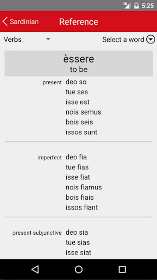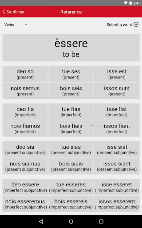 • Verbs: Tests your ability to parse and to conjugate a range of representative regular and irregular Sardinian verbs.