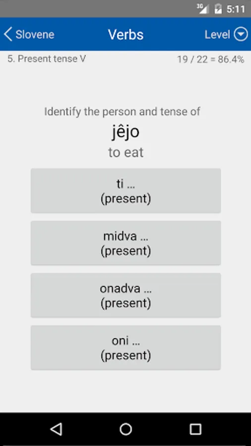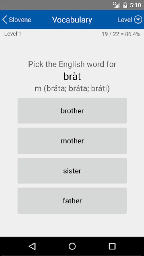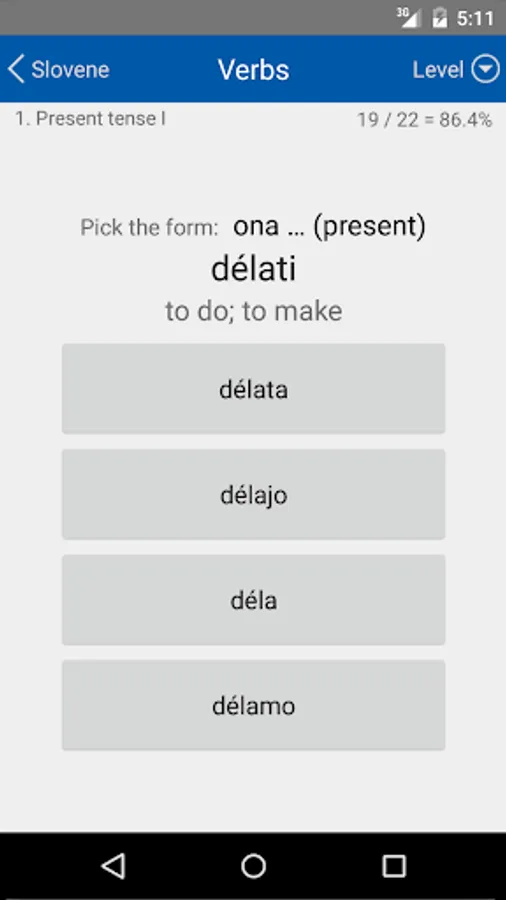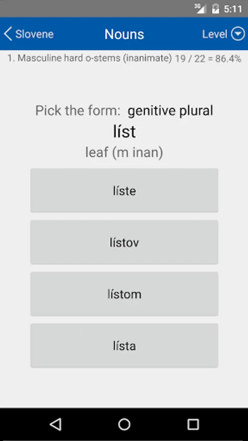 Wherever you have your phone and a free moment, it offers a continuous multiple-choice test on Slovene vocabulary, the declension of nouns, and the conjugation of verbs. Each answer you give is immediately confirmed or corrected, and your knowledge is reinforced by repetition.