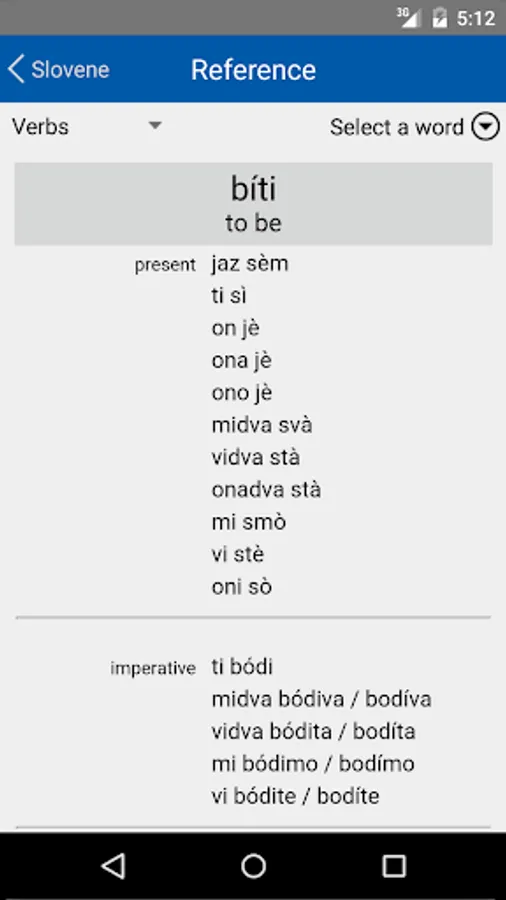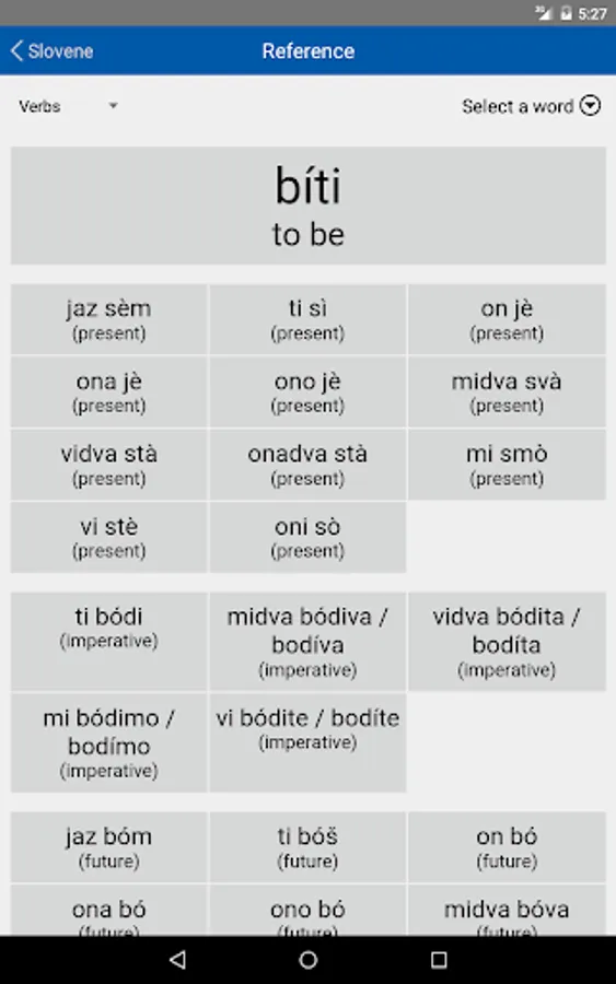 • Verbs: Tests your ability to parse and to conjugate a range of representative Slovene verbs.