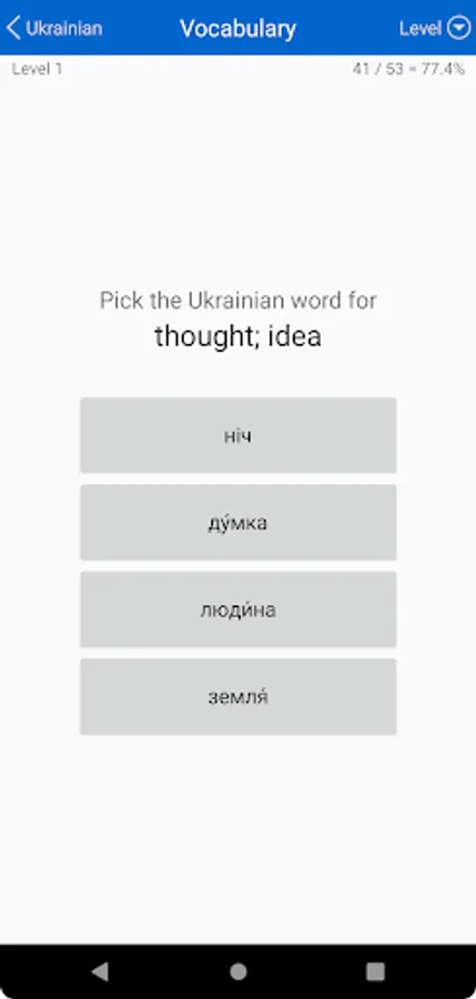 • Vocabulary: 151 levels, each testing the meanings of ten Ukrainian words. Interspersed among these are cumulative levels reviewing what has been learned earlier (giving a total of 171 levels).
