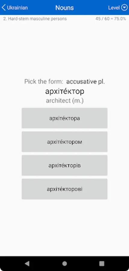 Wherever you have your phone and a free moment, it offers a continuous multiple-choice test on Ukrainian vocabulary and grammar. Each answer you give is immediately confirmed or corrected, and your knowledge is reinforced by repetition.