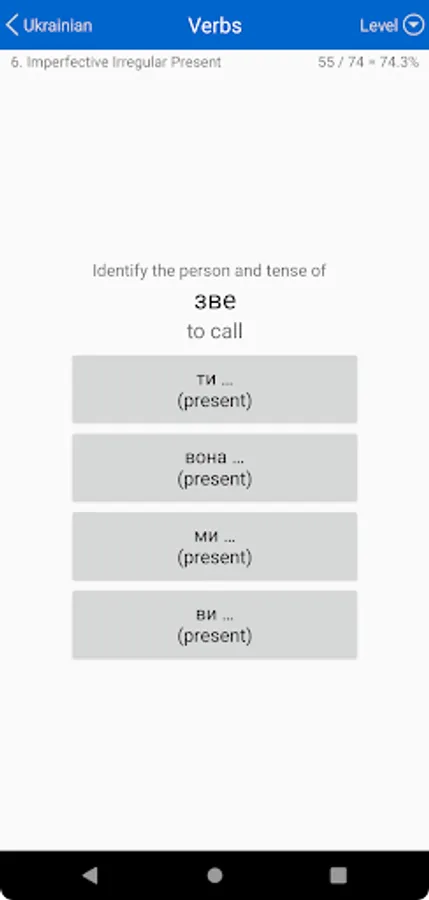 • Verbs: Tests your ability to parse and to conjugate a range of representative Ukrainian verbs.