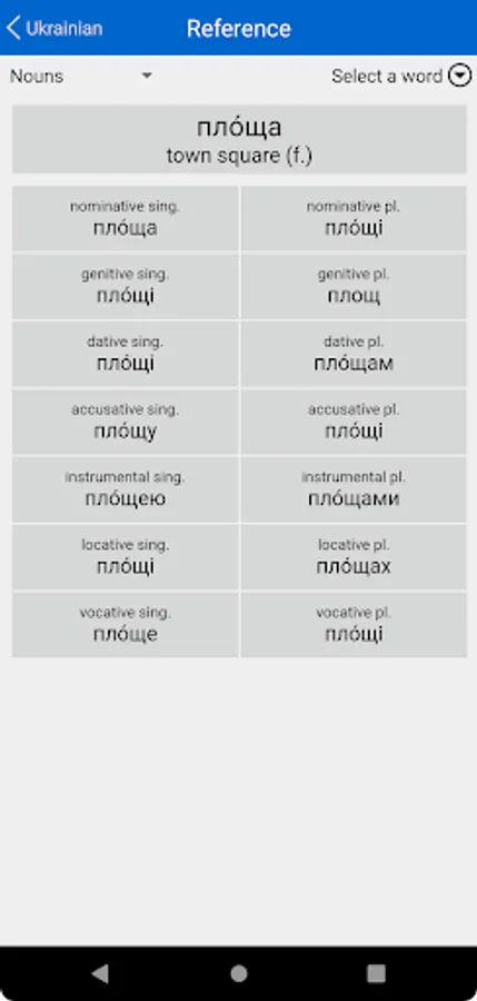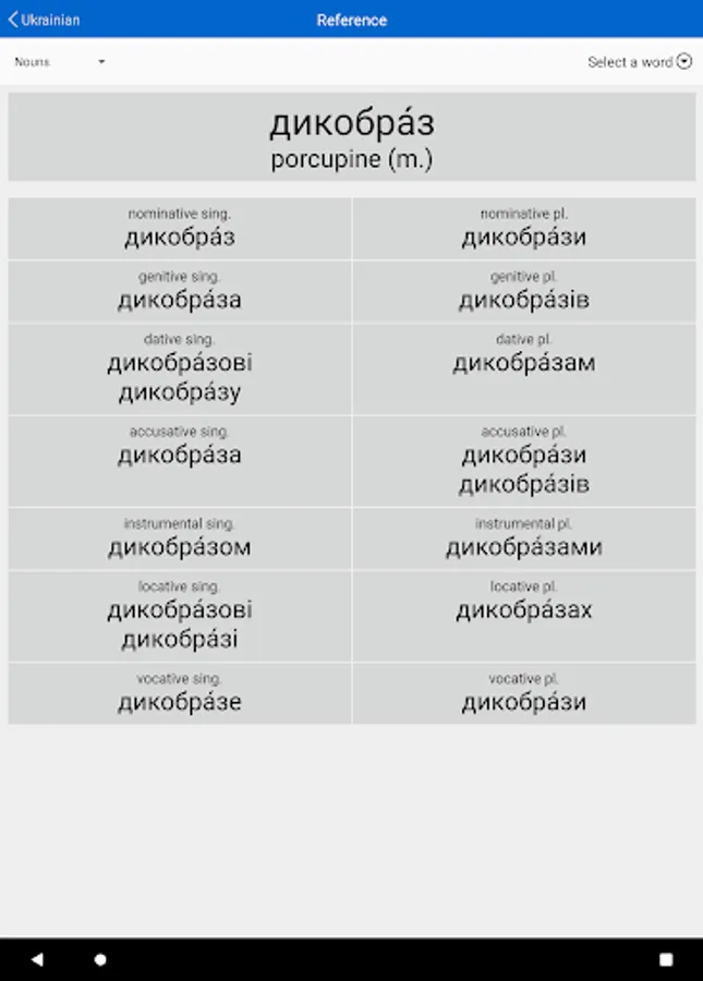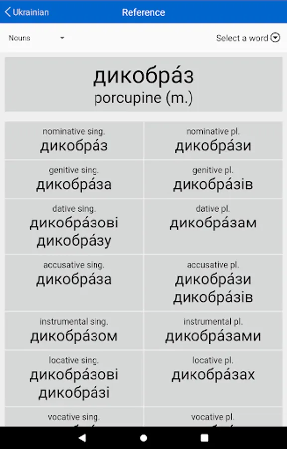 • Nouns: Tests your ability to parse and to decline a wide range of Ukrainian nouns.