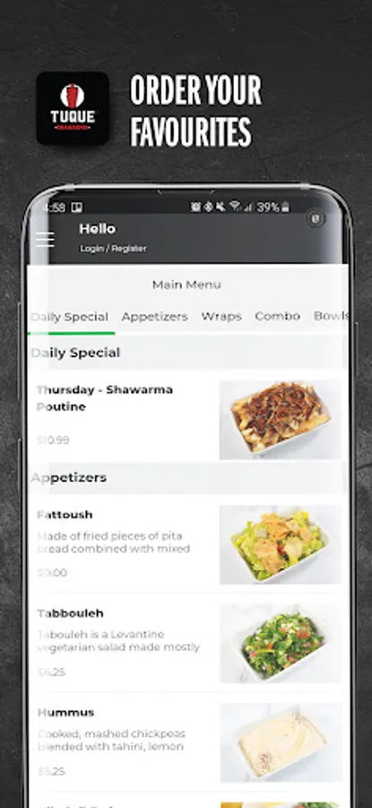Download NOW, order food, satisfy your hunger, and benefit from Tuque Shawarma Food Ordering App!