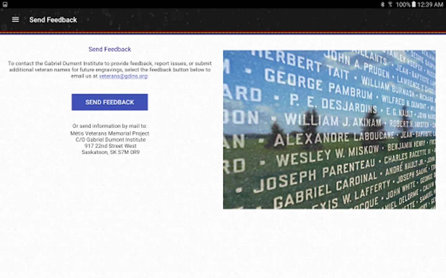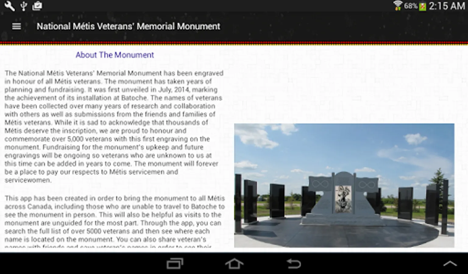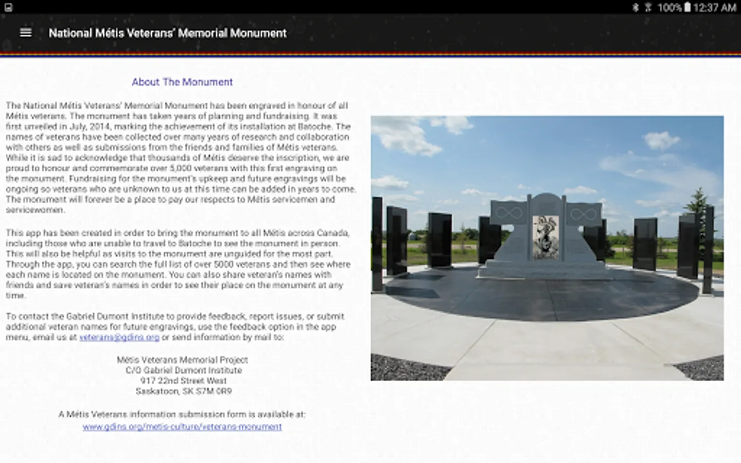 This app has been created in order to bring the monument to all Métis across Canada, including those who are unable to travel to Batoche to see the monument in person. This will also be helpful as visits to the monument are unguided for the most part. Through the app, you can search the full list of over 5000 veterans and then see where each name is located on the monument. You can also share veteran’s names with friends and save veteran’s names in order to see their place on the monument at any time.