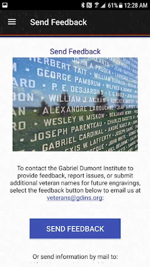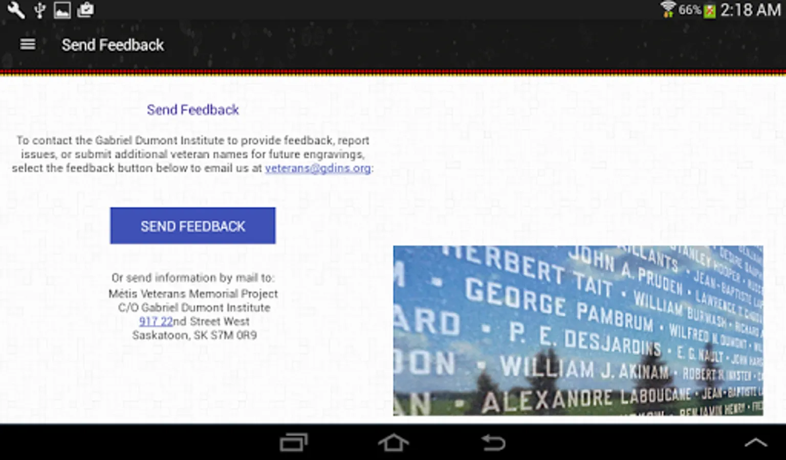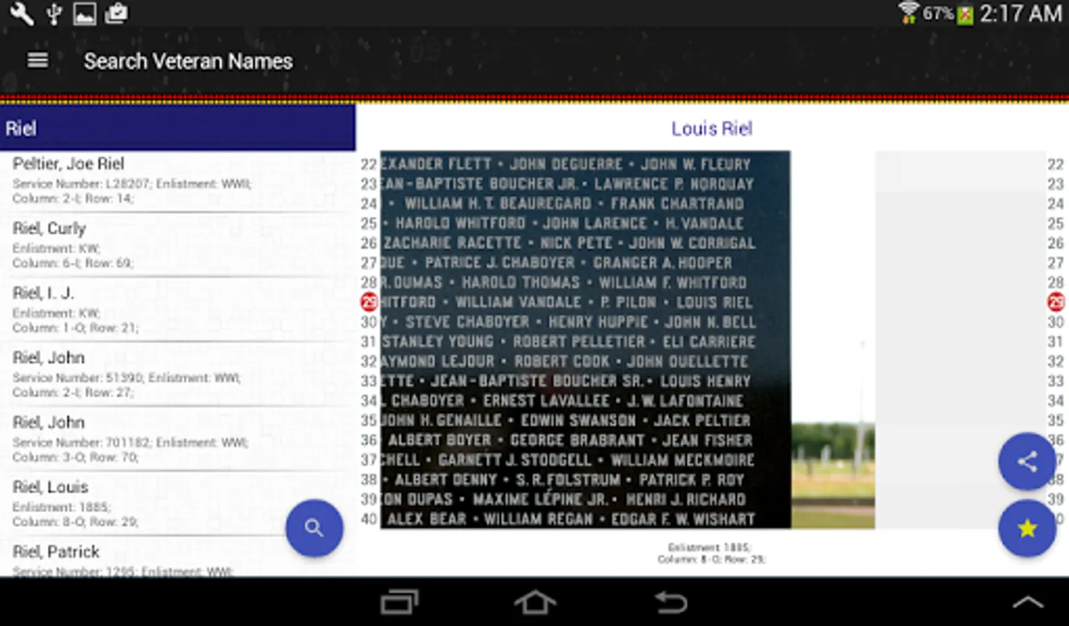This app has been created in order to bring the monument to all Métis across Canada, including those who are unable to travel to Batoche to see the monument in person. This will also be helpful as visits to the monument are unguided for the most part. Through the app, you can search the full list of over 5000 veterans and then see where each name is located on the monument. You can also share veteran’s names with friends and save veteran’s names in order to see their place on the monument at any time.