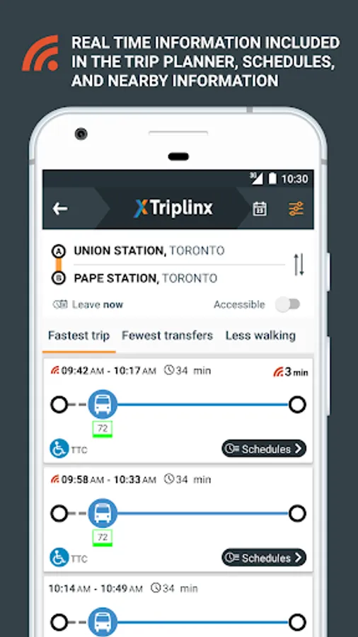 We've been continuously improving Triplinx to serve you better. We are pleased to share a new version of Triplinx. This version now offers integrated real time transit departure information throughout the application along with several other enhancements. The real-time information is currently available for TTC (bus and streetcars only), HSR, YRT, MiWay, Burlington, Brampton and Grand River Transit . Other agencies will be added when their data is available.