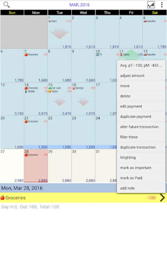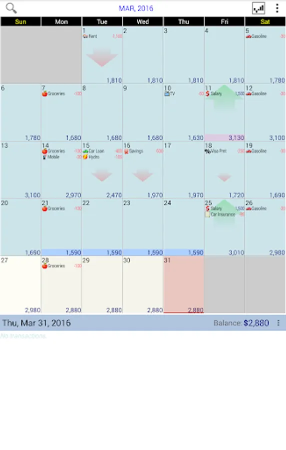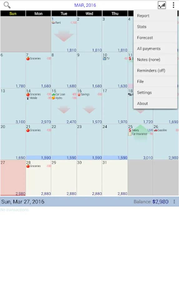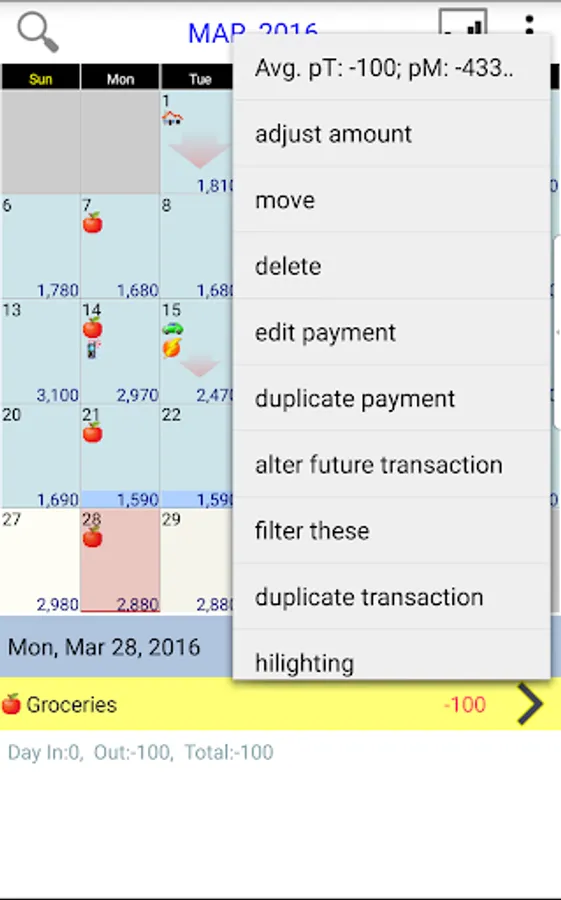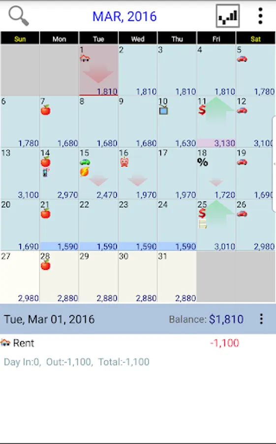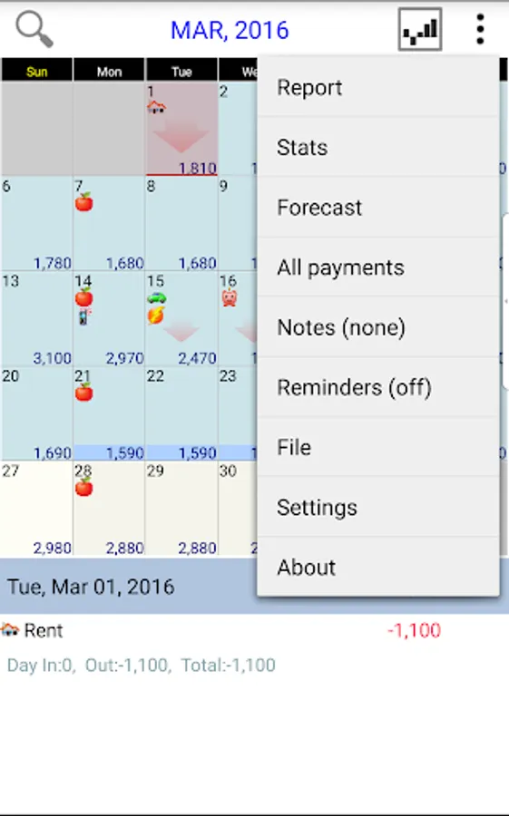 All transactions are shown on a calendar (compare to the complicated ledger system used by some budget applications). Each payment can have a unique icon. Move a transaction to a different day to fit your needs. See where you are going to spend money in the future. Get clear statistics and reports for one or more months. Adjust the budget balance to match your actual balance.