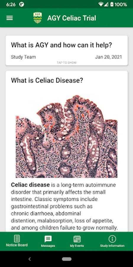 MEDICAL DISCLAIMER: The AGY Celiac app is not intended for diagnosis or screening. Users should be aware that the AGY Celiac app is an information management service and is not intended to be a substitute for the advice of a healthcare professional. Individuals should always consult their doctor or other qualified healthcare professional with any questions they may have regarding a medical condition. You should never disregard professional medical advice or delay in seeking it because of information transmitted to or contained in this app.