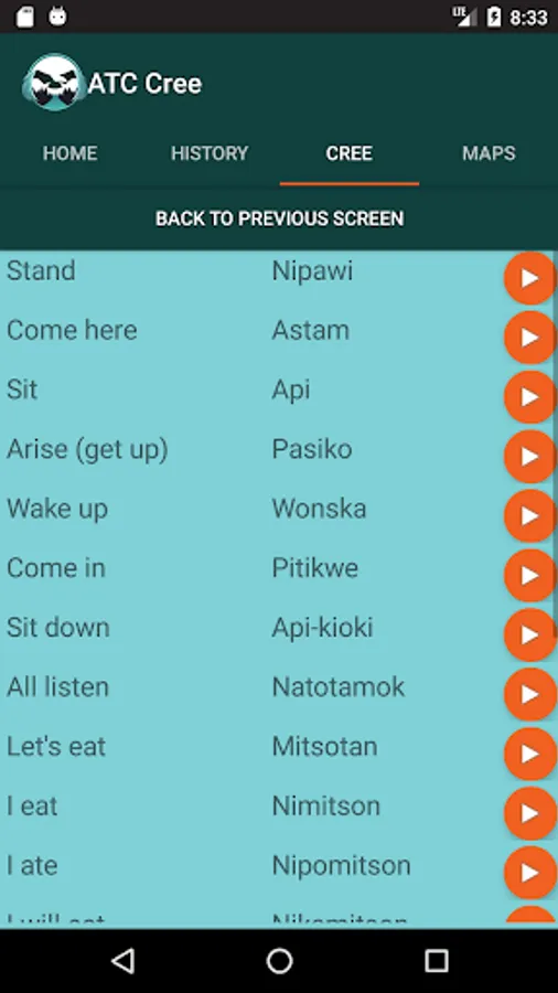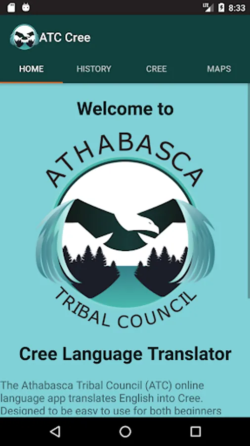 The Athabasca Tribal Council (ATC) online language app translates English into Cree. Designed to be easy to use for both beginners and those with some previous knowledge of the language, it can be used for self-study or as an aid in conversation with elders who are Cree speakers. It is suitable for use by beginners, youth, and those in mid-life looking for a refresher in a language they learned in their youth.