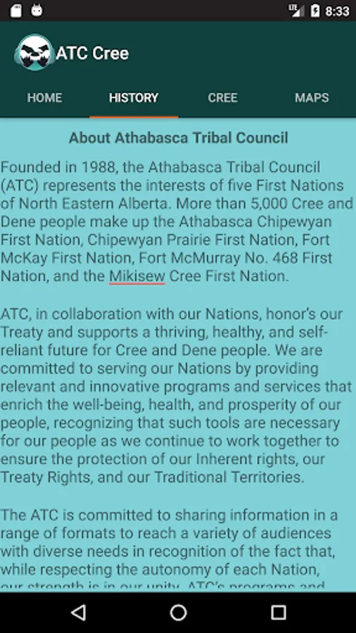 The app’s vocabulary includes important nouns, as well as words for medicines, numbers, directions, weather, the calendar, and parts of the body. The app focuses on Cree dialects of northeastern Alberta. It also includes an overview of the Athabasca Tribal Council, as well as maps and satellite images showing the locations of its five member First Nations in North Eastern Alberta. The app is part of ATC’s commitment to teaching and preserving the indigenous languages of northeastern Alberta.