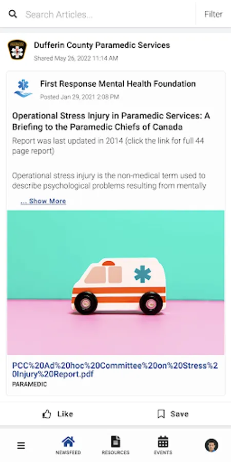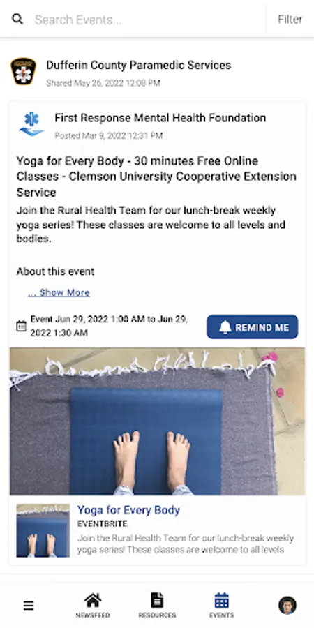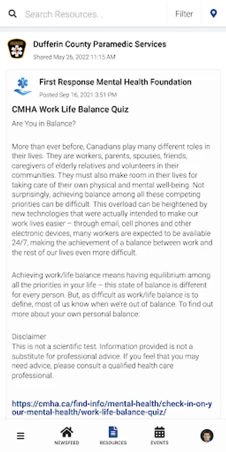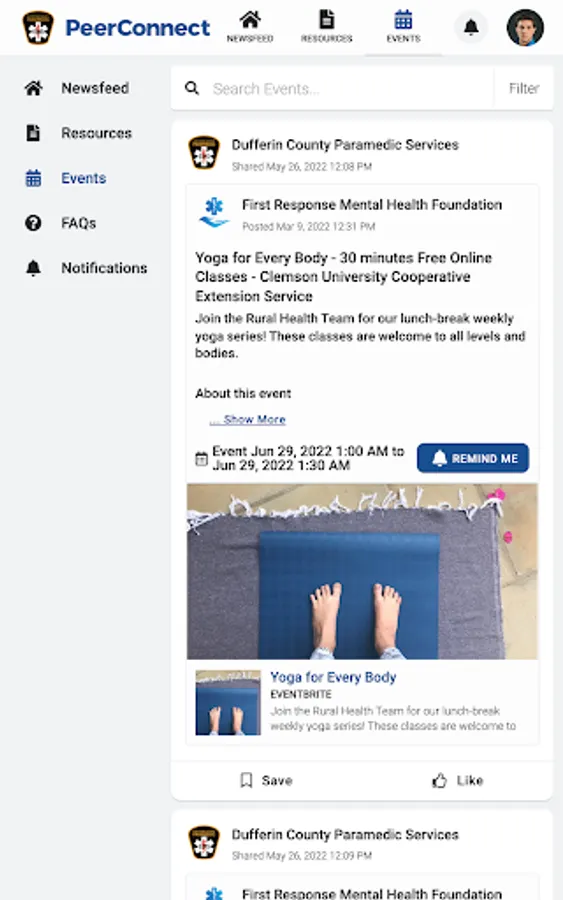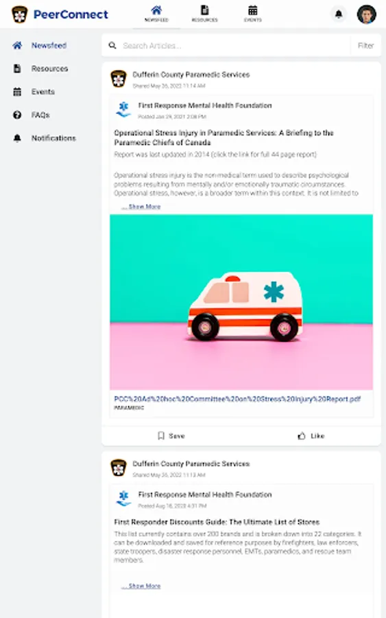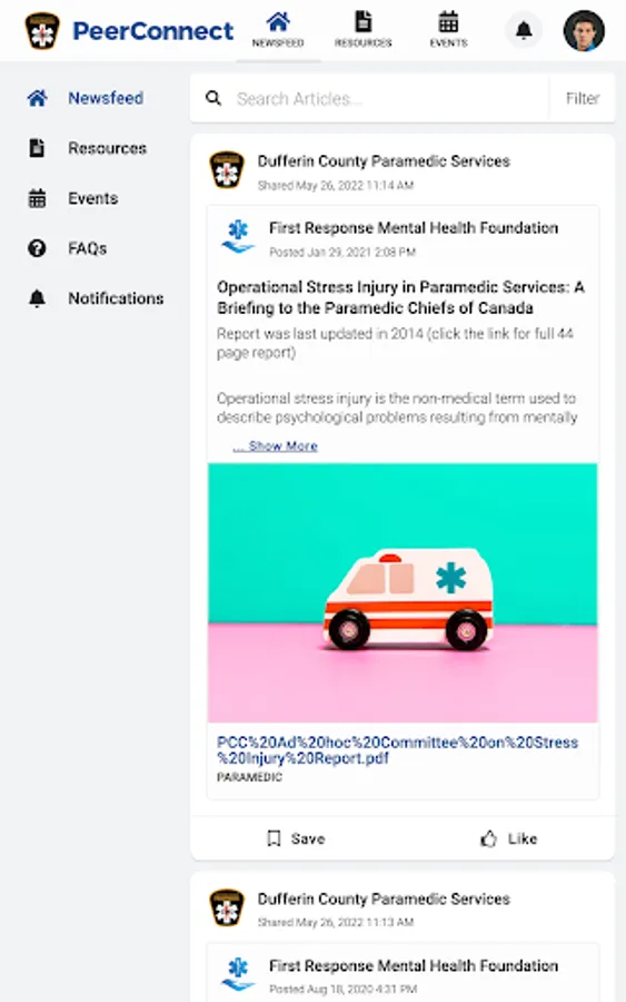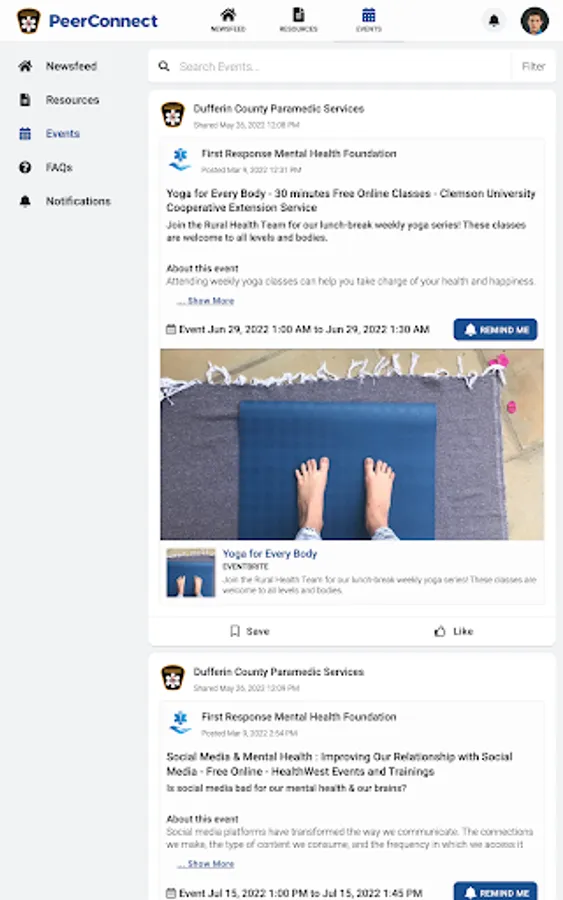DCPS PeerConnect connects the public to information about Dufferin County Paramedic Services programming and services. Users have access to newsfeed articles, resources, and events related to mental health, wellness, culture, and belonging.