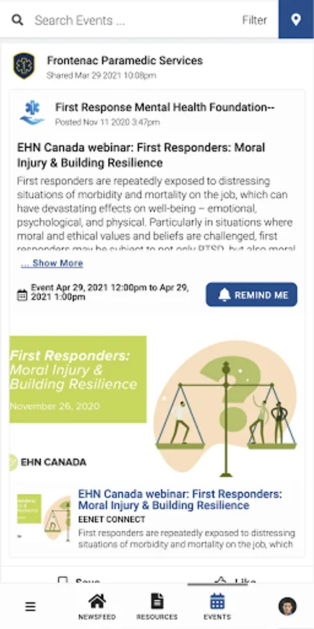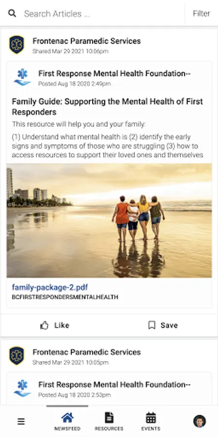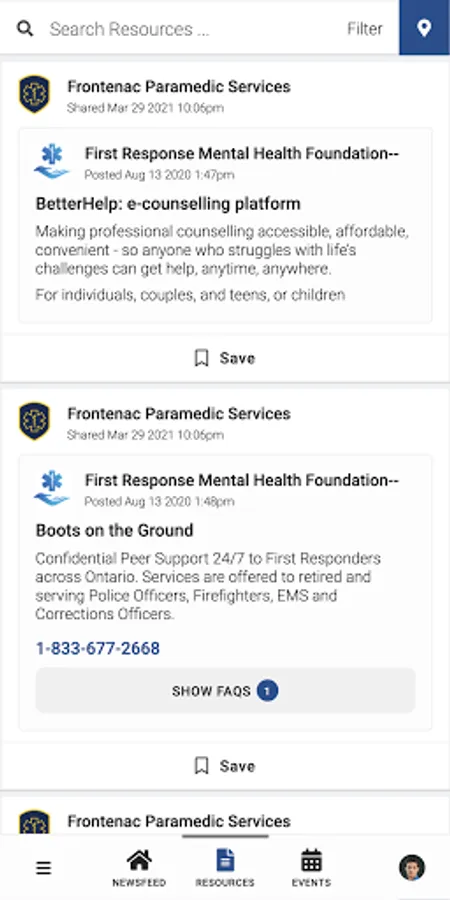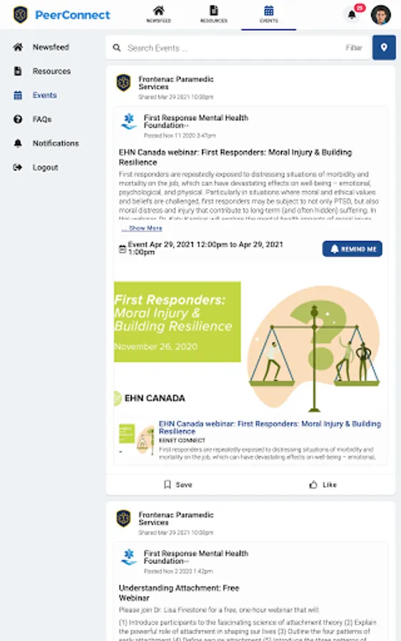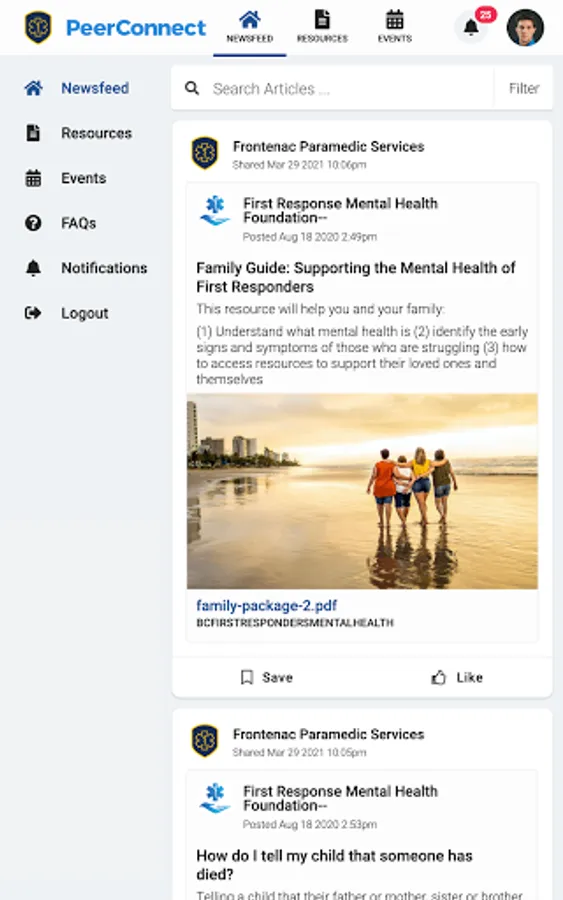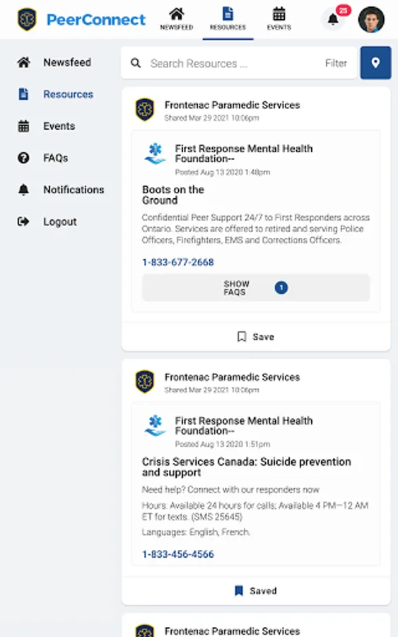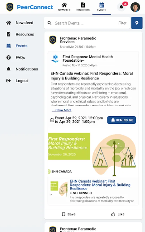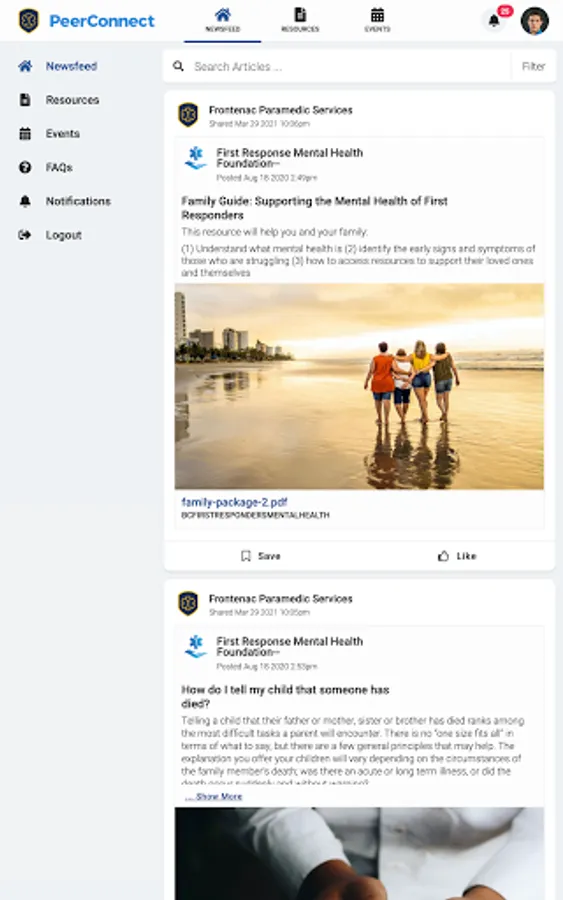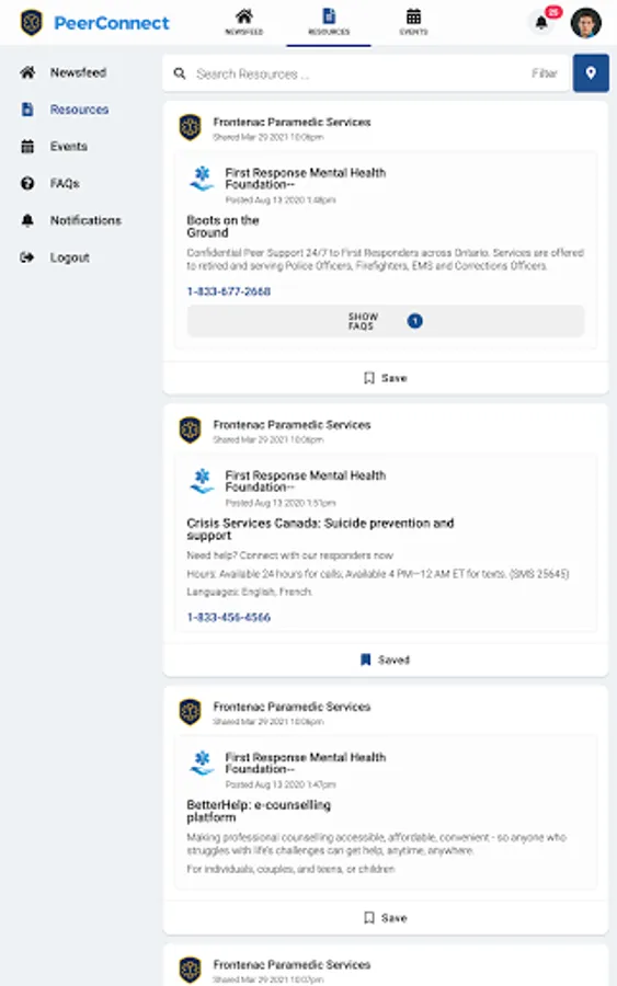 Frontenac PS PeerConnect connects the public to information about Frontenac Paramedic Services' programming and services. Users have access to newsfeed articles, resources, and events related to mental health, wellness, culture, and belonging.
