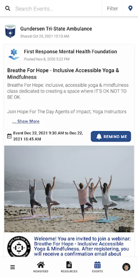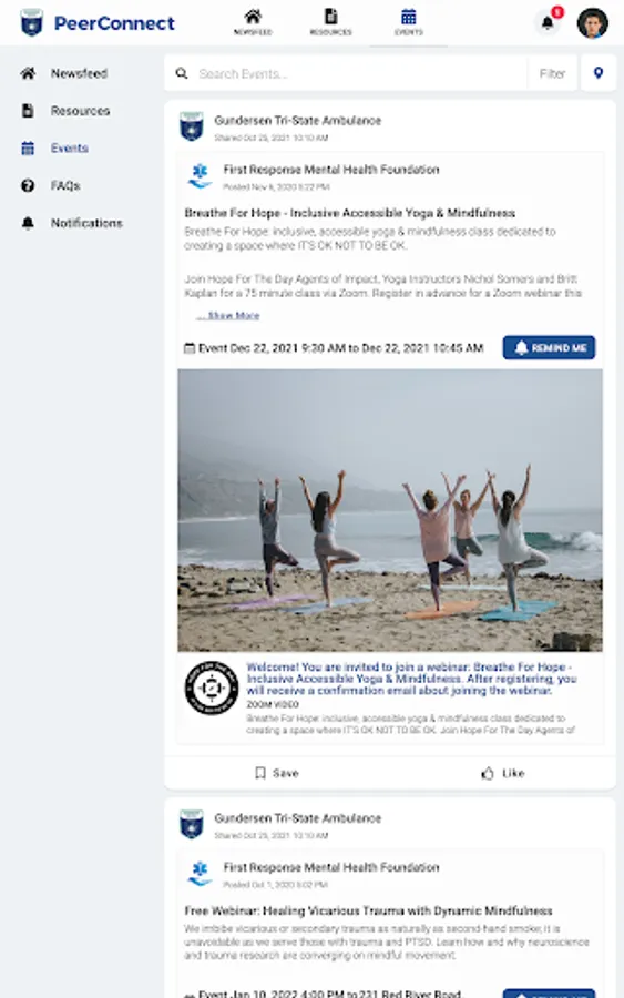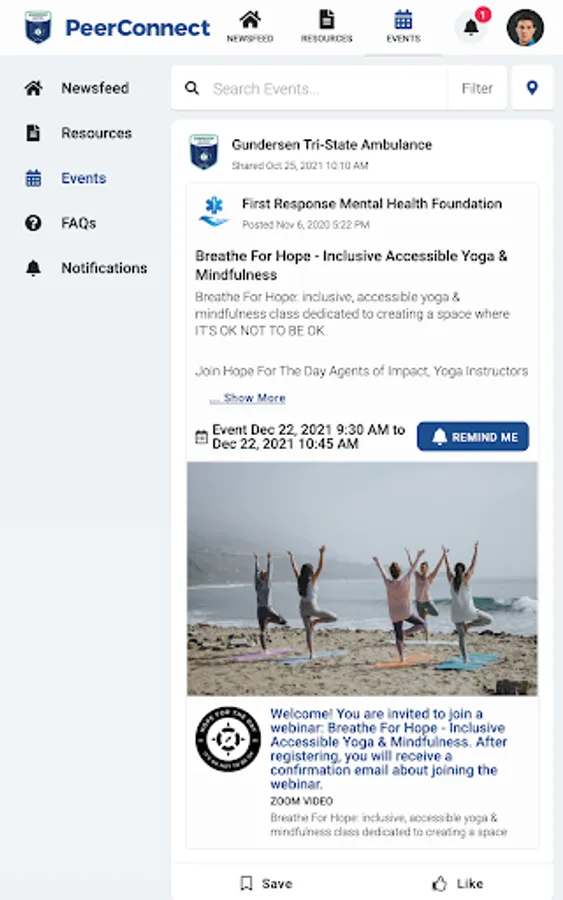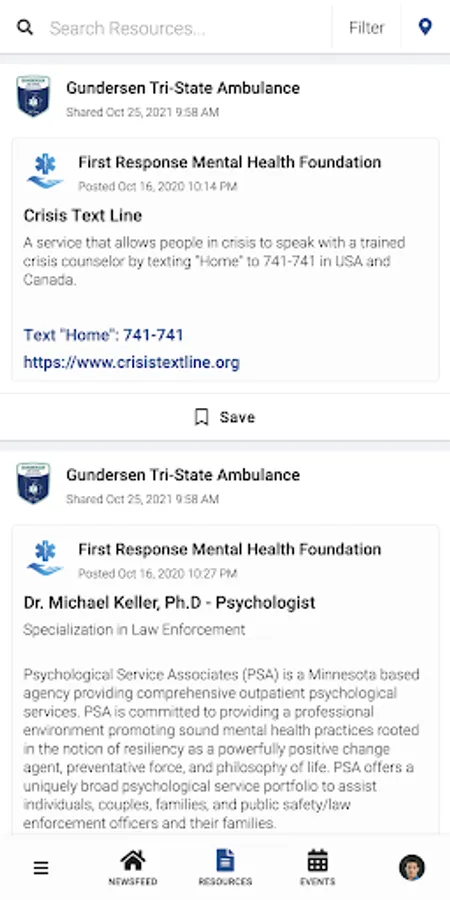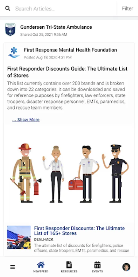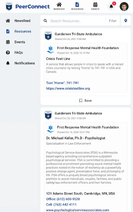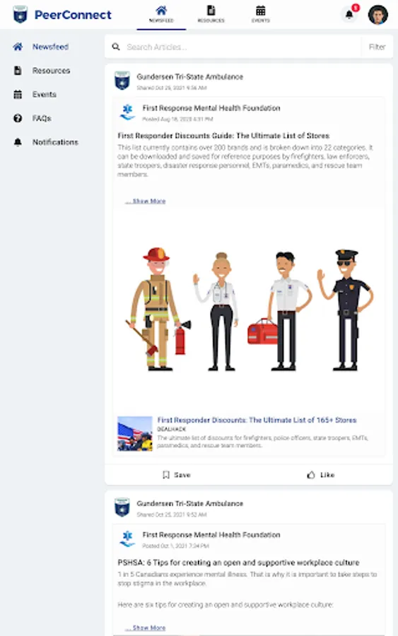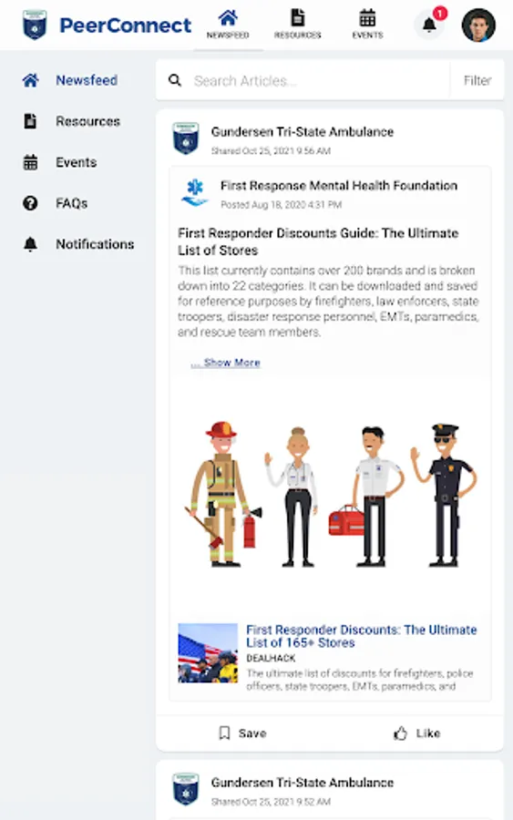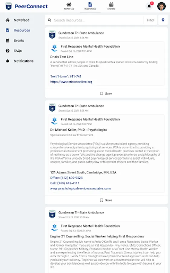 GHS Ambulance PeerConnect connects the public to information about Gundersen Tri-State Ambulance programming and services. Users have access to newsfeed articles, resources, and events related to mental health, wellness, culture, and belonging.
