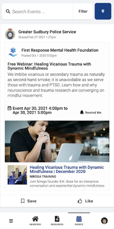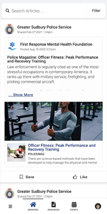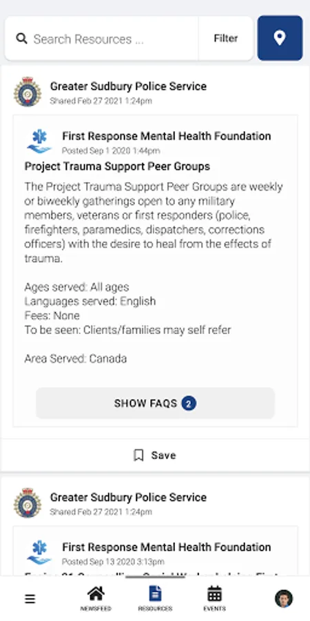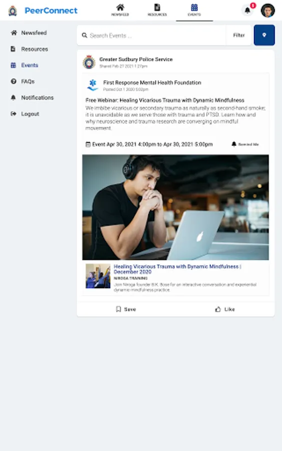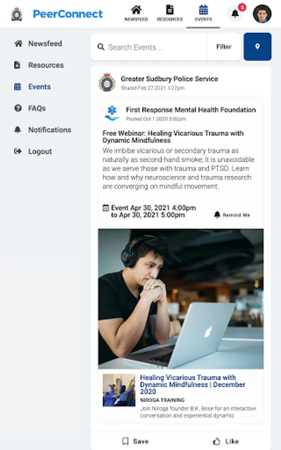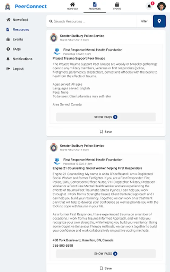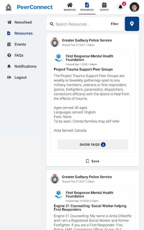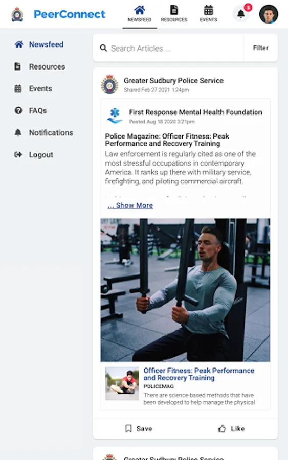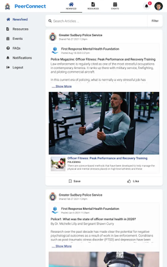 GSPS PeerConnect connects the public to information about Greater Sudbury Police Services' programming and services. Users have access to newsfeed articles, resources, and events related to mental health, wellness, culture, and belonging.