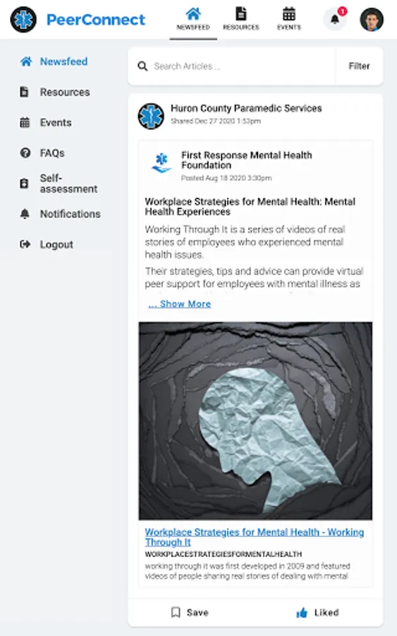 Huron County PS PeerConnect users have access to newsfeed articles, resources, and events related to mental health, wellness, culture, and belonging.