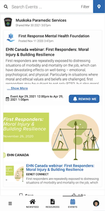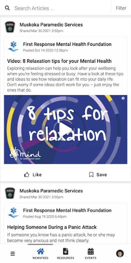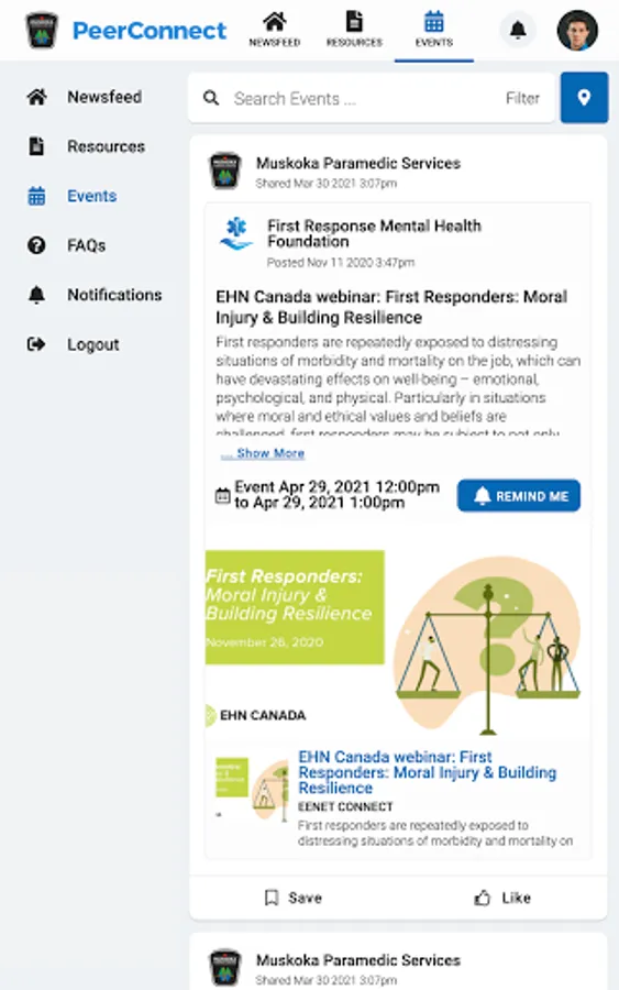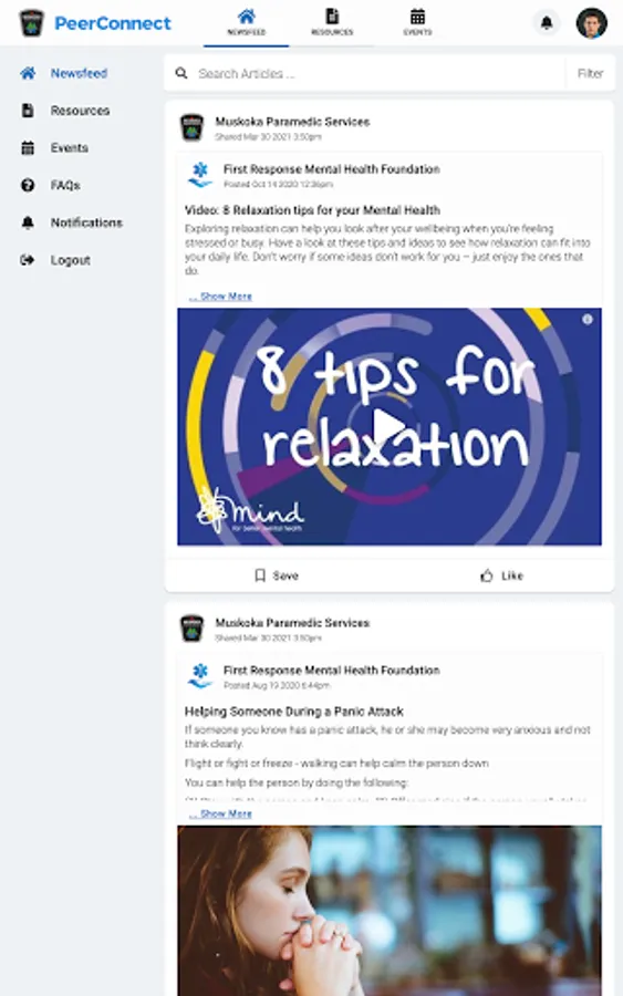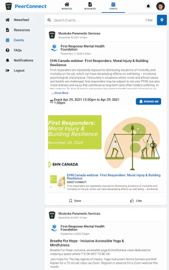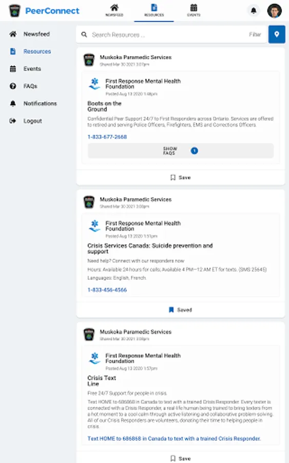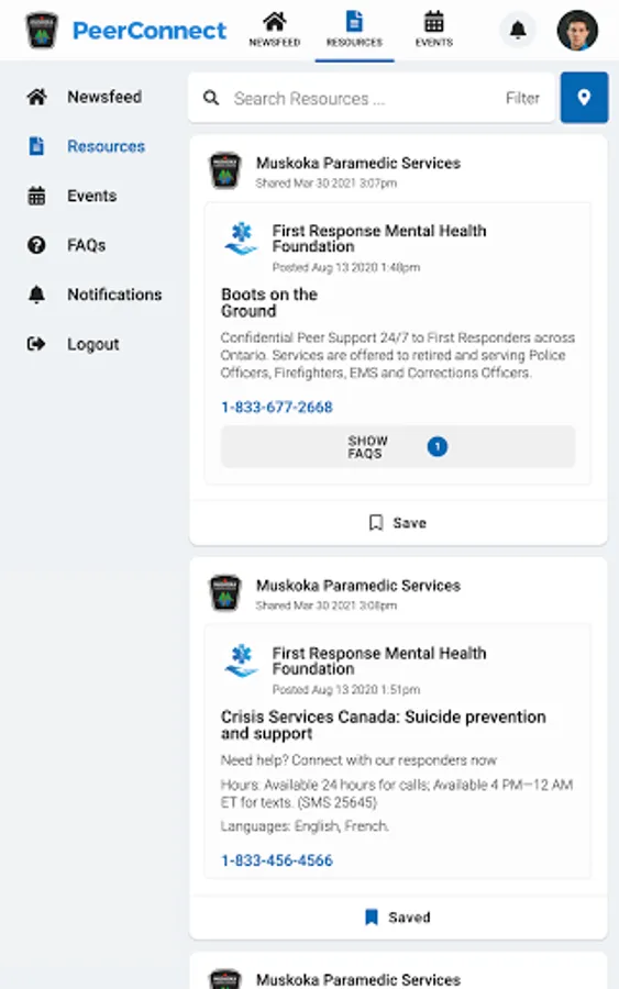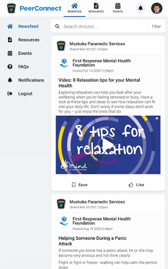 Muskoka PS PeerConnect connects the public to information about Muskoka Paramedic Services' programming and services. Users have access to newsfeed articles, resources, and events related to mental health, wellness, culture, and belonging.