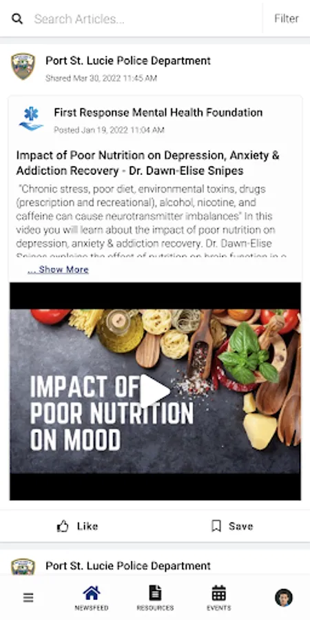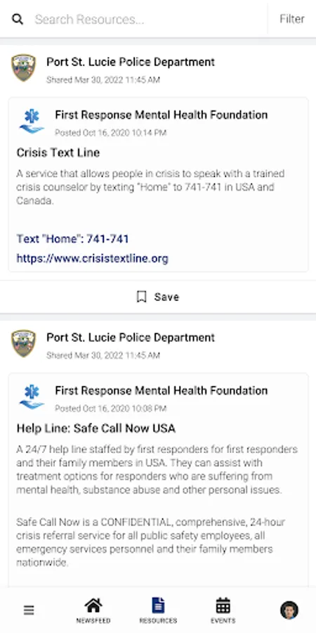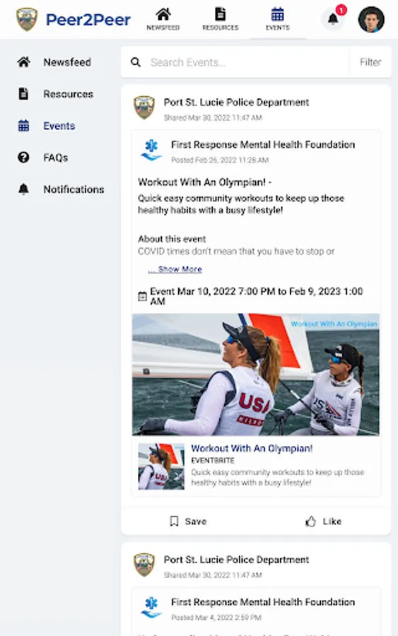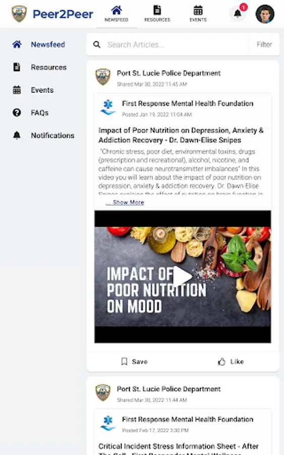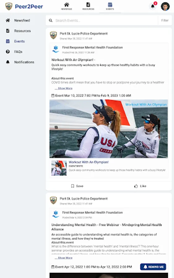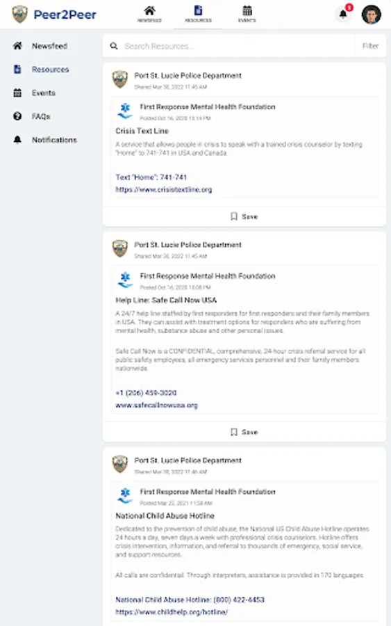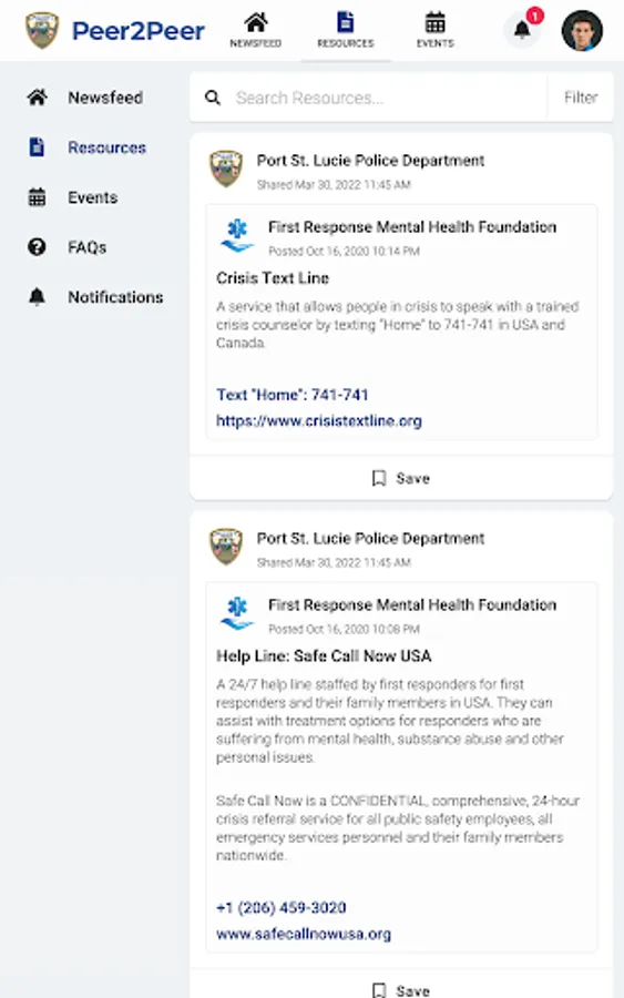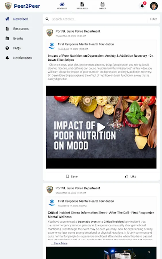 PSLPD Peer2Peer connects the public to information about Port St. Lucie Police Department's programming and services. Users have access to newsfeed articles, resources, and events related to mental health, wellness, culture, and belonging.