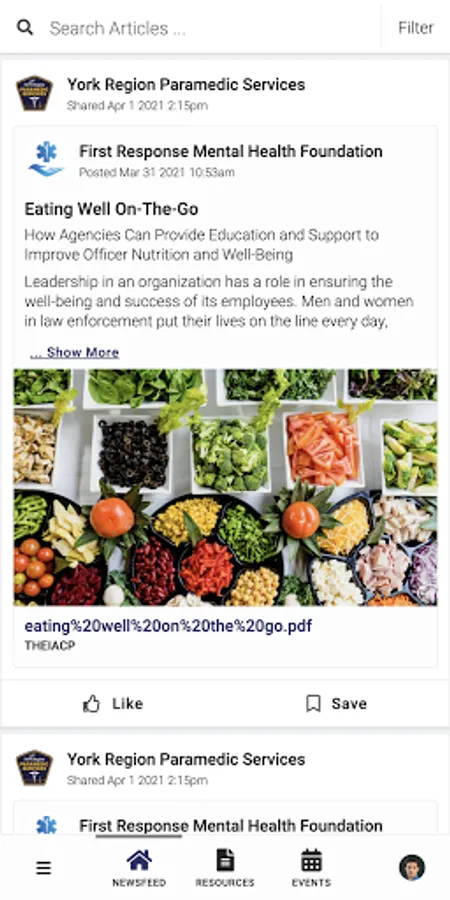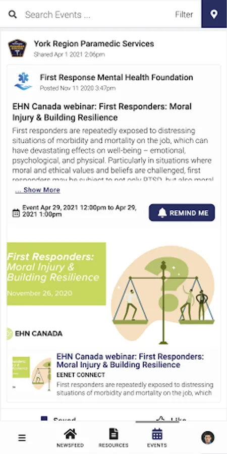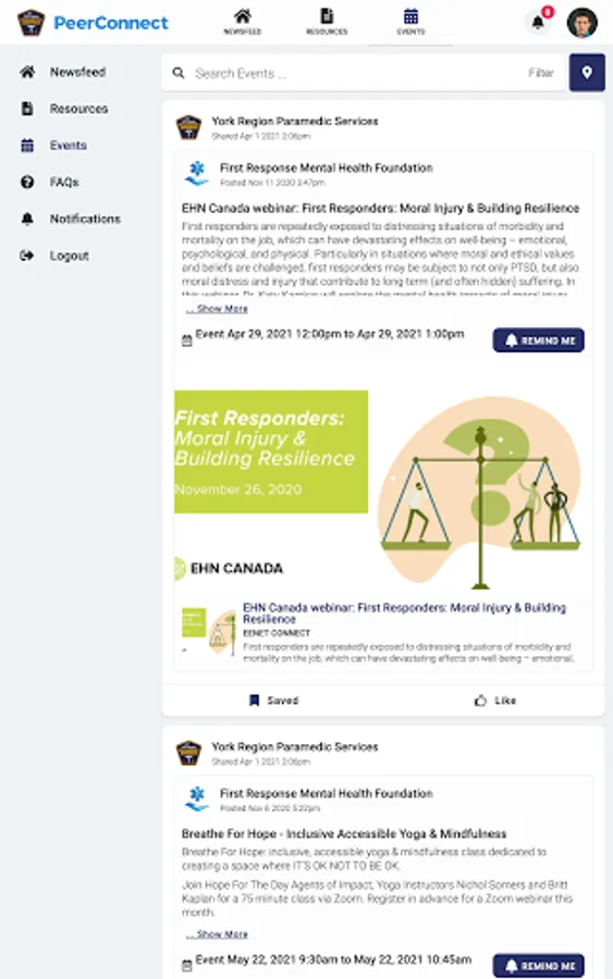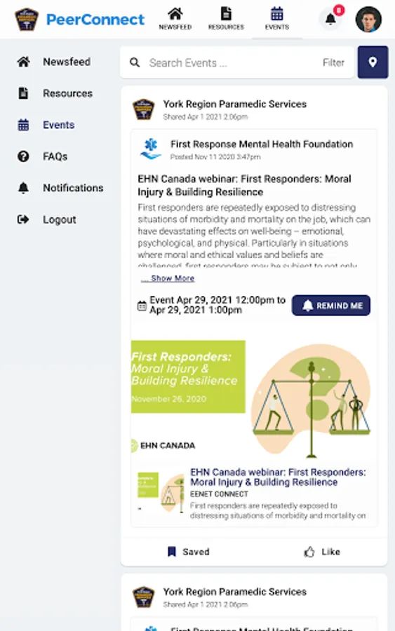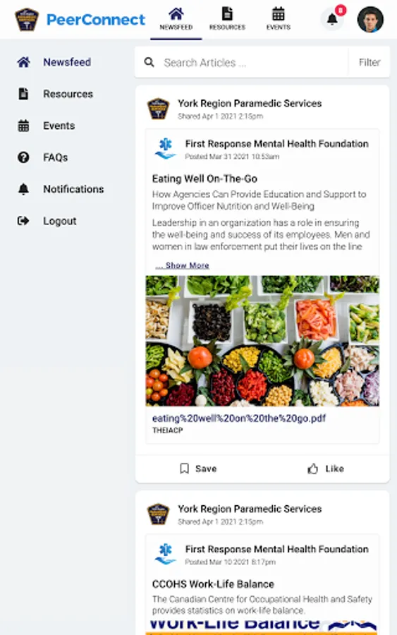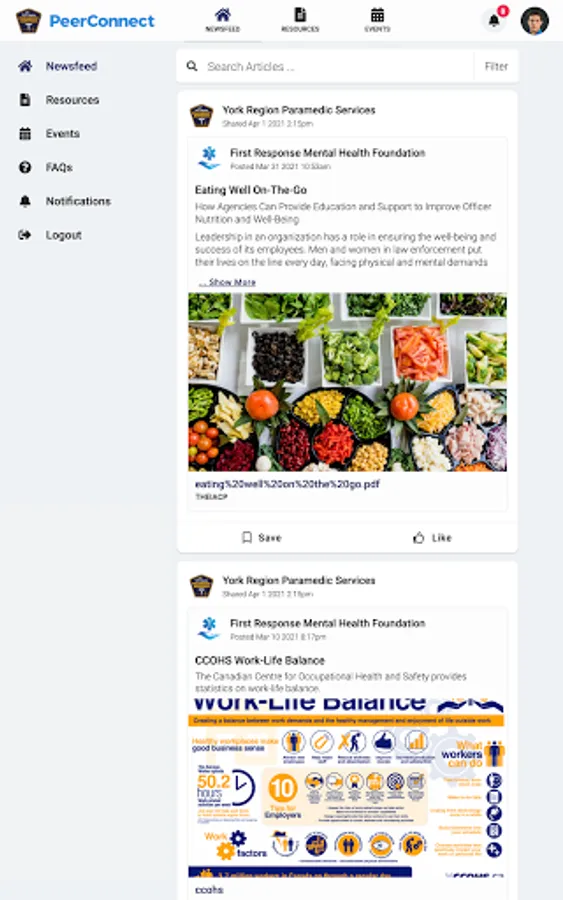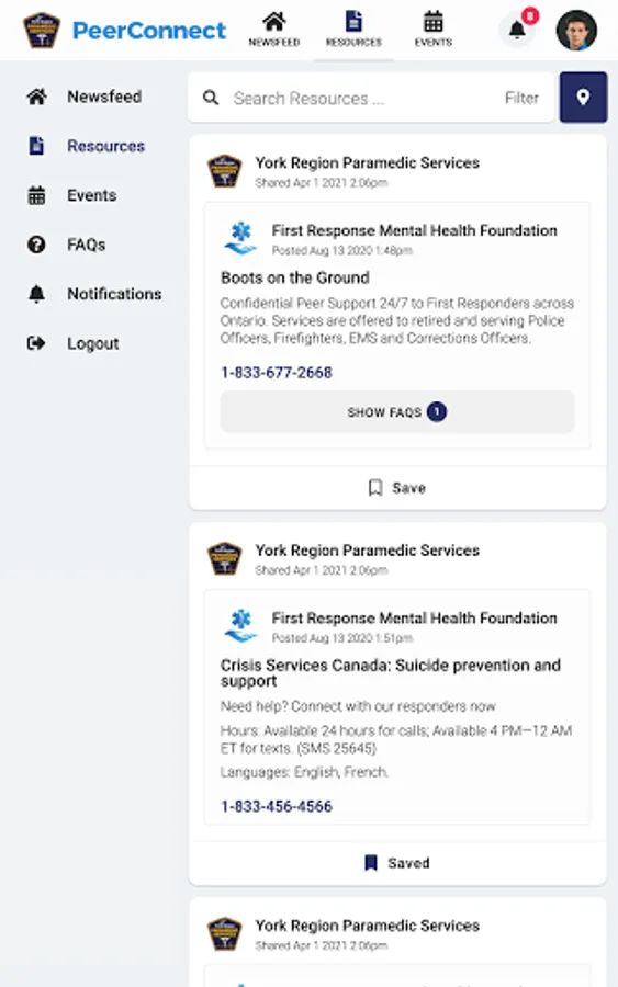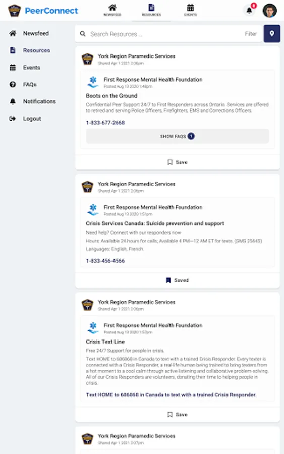 York Region PS PeerConnect connects the public to information about York Region Paramedic Service's programming and services. Users have access to newsfeed articles, resources, and events related to mental health, wellness, culture, and belonging.