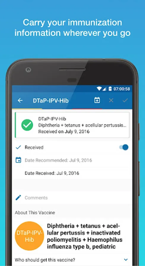 Track childhood, adult, and travel vaccinations for yourself and your family members.